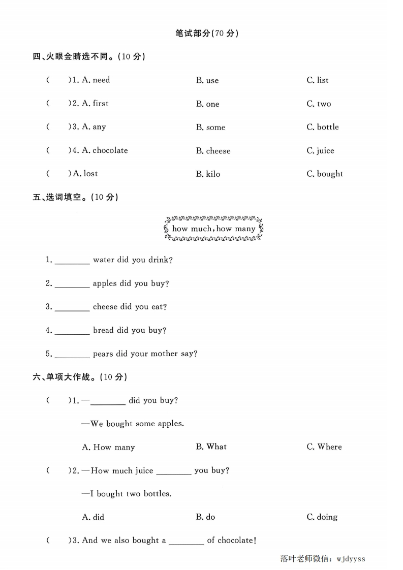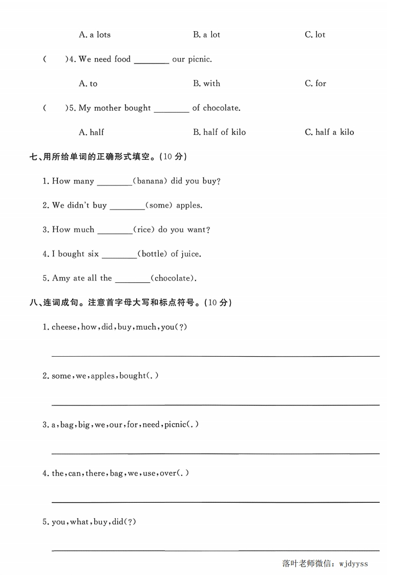 2025外研版五年级英语上册单元测试卷第二单元测试卷扫码听听力(检测时间:60分钟满分:100分)霸题序三四五六七八九十总分得分听力部分(30分)】密一、听录音,选出你所听到的单词或词组。(10分)(毁封)1.A.lostB.listC.best)2.A.how oldB.how manyC.how much线)3.A.canB.candyC.chocolate内()4.A.halfB.afterC.for童)5.A.cheeseB.us不C.use二、听录音,为下列图片排序。(10分)】要④答回阿图崭题三、听录音,根据所听问句选出合适的答语。(10分)()1.A.Four apples.B.Four bottles.C.I bought apples.)2.A.She ate it all.B.We bought pears.C.I like pears.)3.A.Two bottles.B.Some juice,please.C.Four.☒()4.A.Yes,she is.B.Yes,she did.C.Yes,she does.()5.A.Two bottles.B.Two.C.Half a kilo.落叶老师微信:wjdyyss