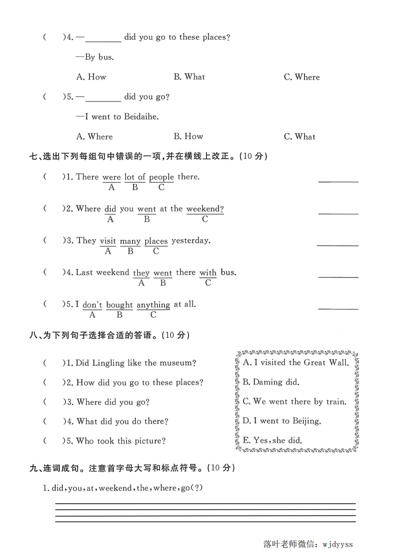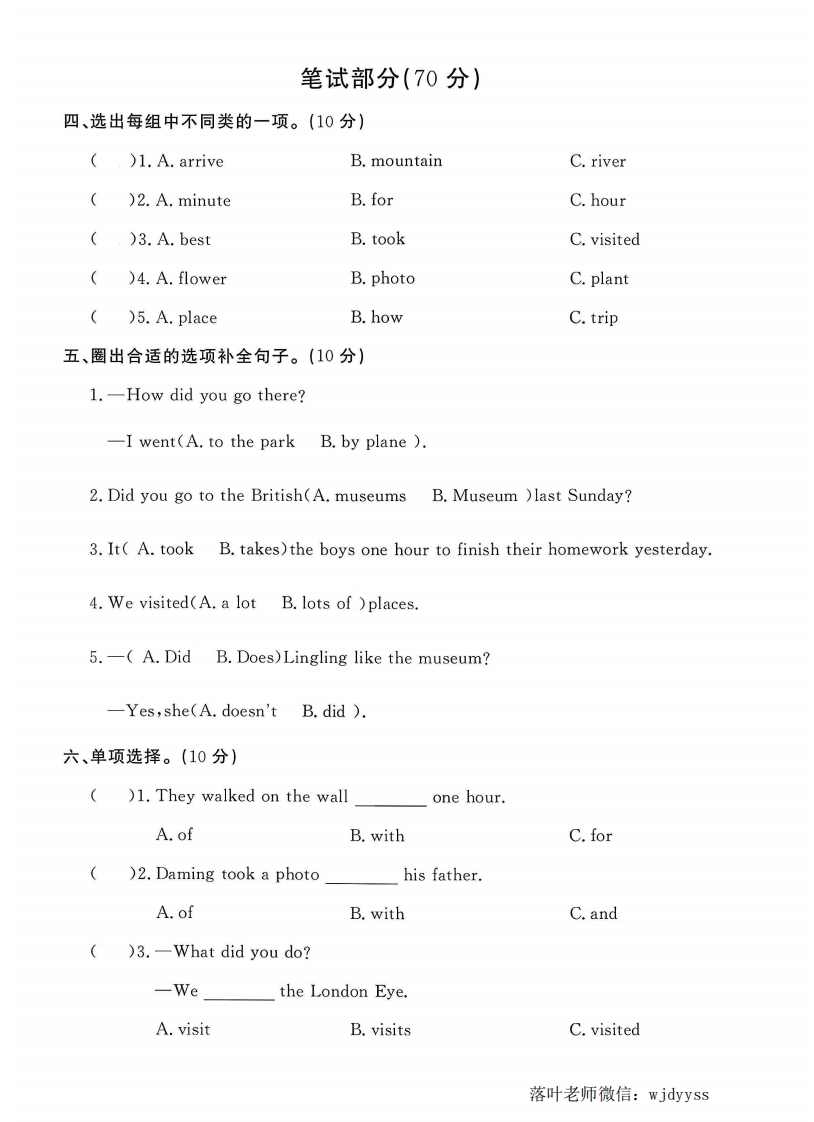 2025外研版五年级英语上册单元测试卷第三单元测试卷都检测时间:60分钟满分:100分题序三四五六七八九总分得分听力部分(30分)密一、听录音,选出你所听到的单词。(10分)扫码听听力毁封)1.A.mountainB.museumC.monkey()2.A.wallB.fallC.tall线()3.A.agoB.alongC.arrive内)4.A.withB.visitC.way童不)5.A.pleaseB.plantC.place二、听录音,为下列图片排序。(10分)】要答题三、听录音,根据你所听到的问句选答语。(10分)()1.A.We visited Big Ben.B.This is Big Ben.)2.A.I went to Beidaihe.B.I like Beidaihe.)3.A.We went to school.B.We went by bus.☒()4.A.Yes,she do.B.Yes,she did.)5.A.I went swimming.B.I went by train.落叶老师微信:wjdyyss