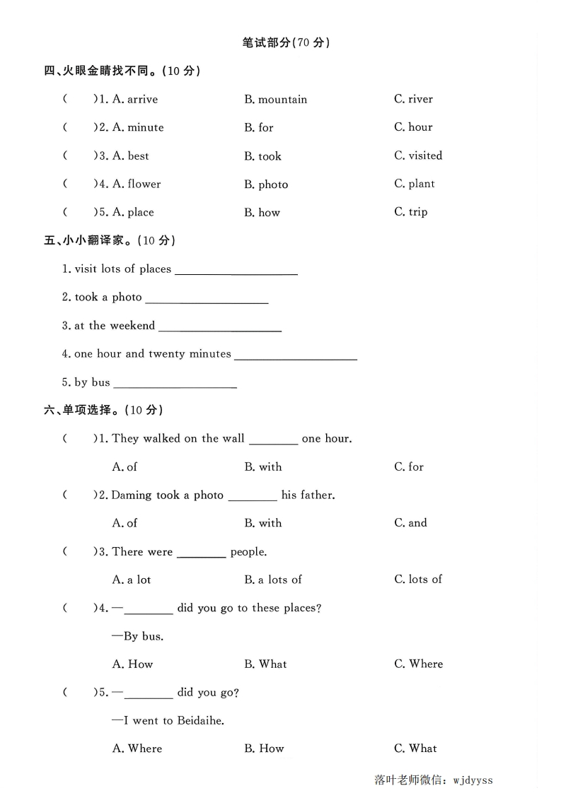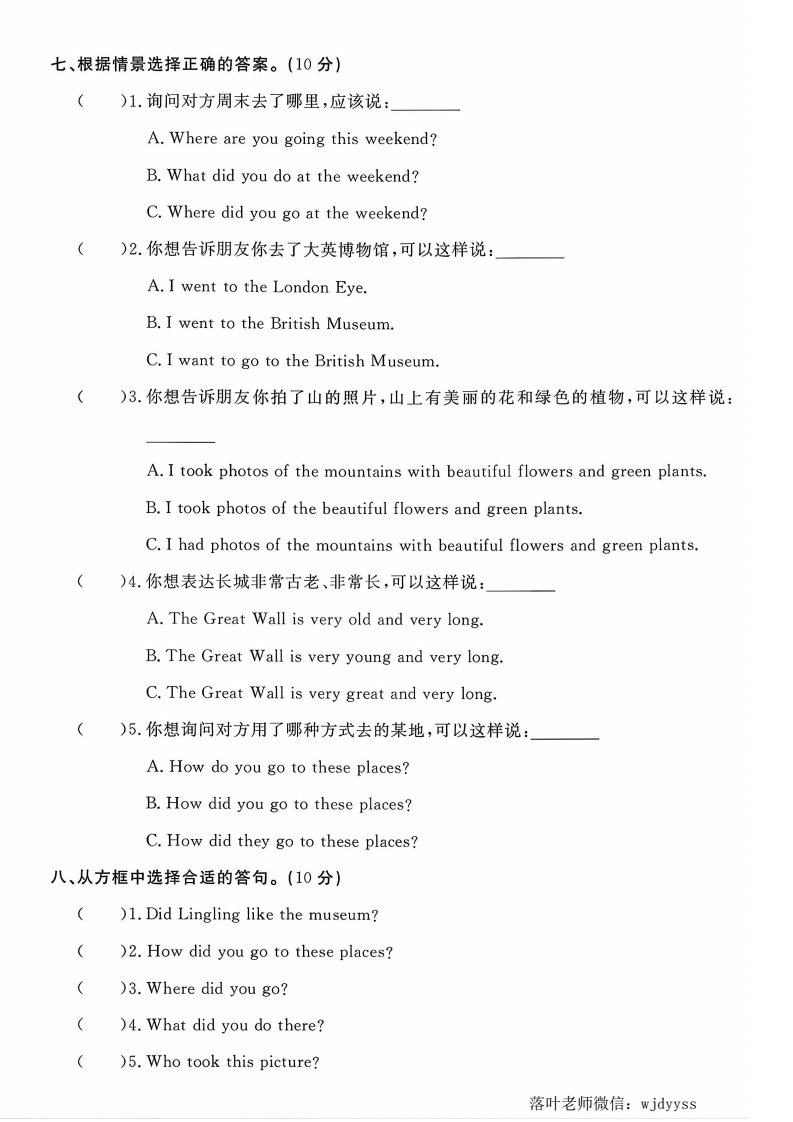 2025外研版五年级英语上册单元测试卷第三单元测试卷扫码听听力(检测时间:60分钟满分:100分)》器题序二三四五六七八九十总分得分听力部分(30分)】密一、听录音,选出你所听到的单词或词组。(10分)()1.A.pleaseB.placeC.plane毁封()2.A.makeB.takeC.took线()3.A.forB.overC.of内()4.A.plantB.antC.plan黨(B.riverC.love不)5.A.ring二、听录音,为下列图片排序。(10分)要答靠题三、听录音,根据你所听到的问句选答语。(10分))1.A.We visited Big Ben.B.This is Big Ben.)2.A.I went to Beidaihe.B.I like Beidaihe.()3.A.We went to school.B.We went by bus.☒()4.A.Yes,she do.B.Yes,she did.()5.A.I went swimming.B.I went by train.落叶老师微信:wjdyyss