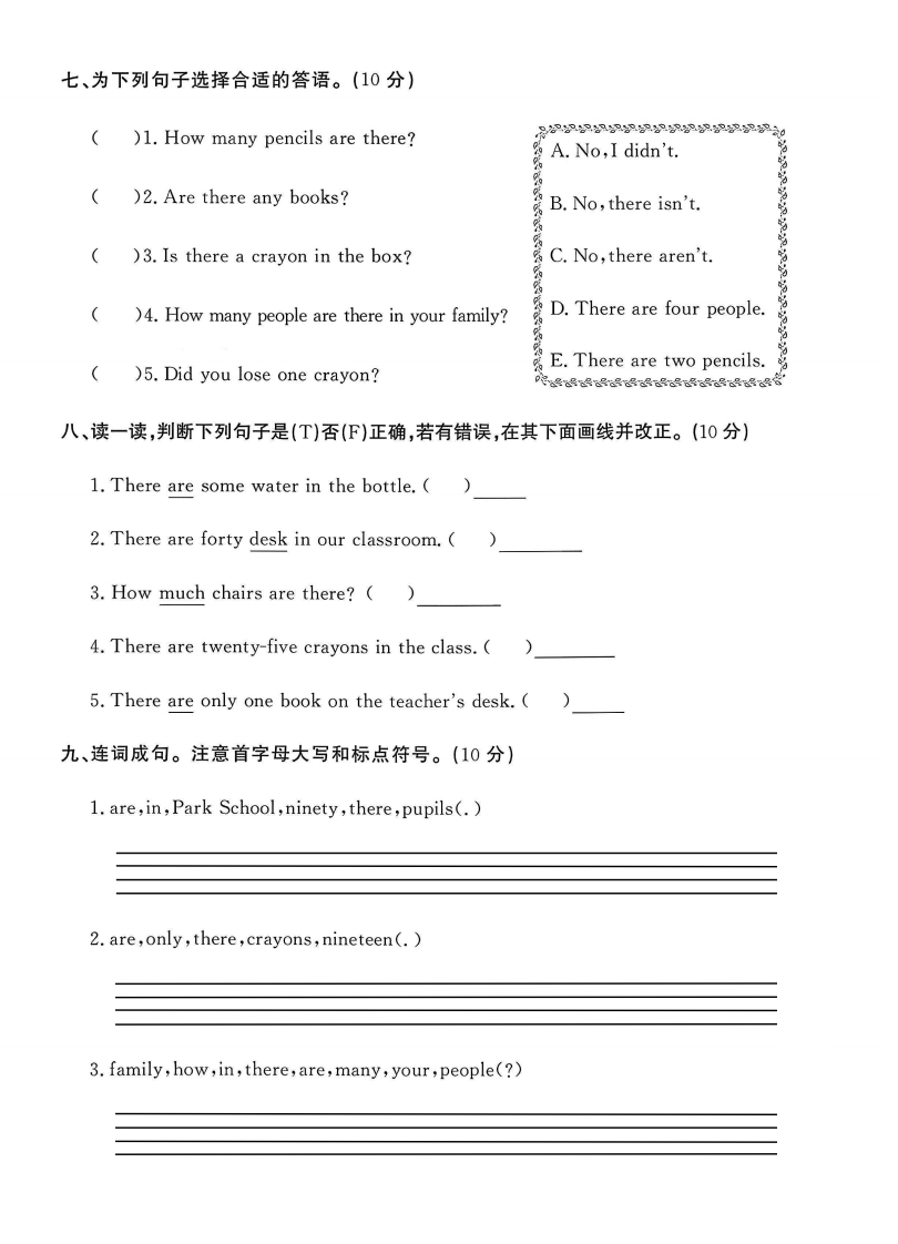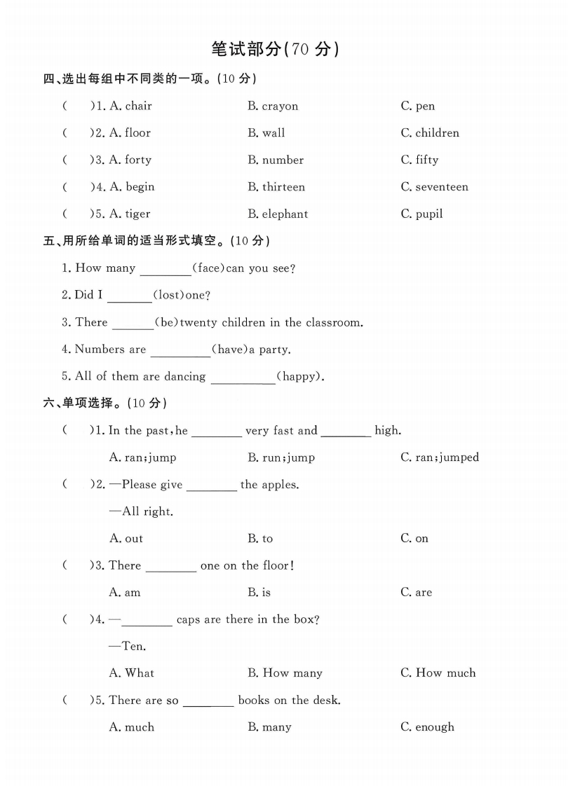 2025外研版五年级英语上册单元测试卷第五单元测试卷霏时间:60分钟满分:100分题序三四五六七八九十总分得分听力部分(30分)密一、听录音,选出你所听到的单词。(10分)码听听万额封()1.A.nineteenB.nineC.ninety()2.A.candyB.crayonsC.carry线()3.A.floorB.flowerC.foot内()4.A.BritishB.belongC.begin童不)5.A.fourB.fortyC.fifty二、听录音,为下列图片排序。(10分)要答靠题三、听录音,判断下列句子与你所听到的内容是(T)否(F)相符。(10分))1.Numbers are having a party.()2.How many faces can you see?)3.There are three crayons.But there are four children.☒()4.All of them are dancing happily.()5.There are thirty computers in Park School.