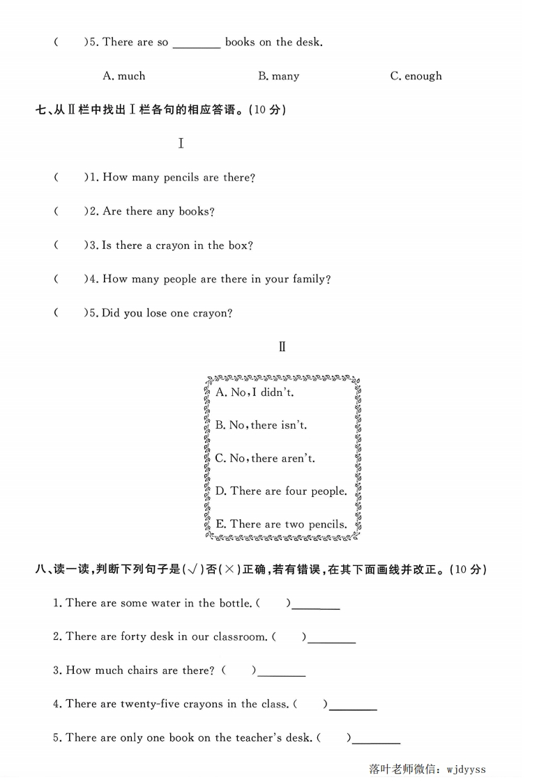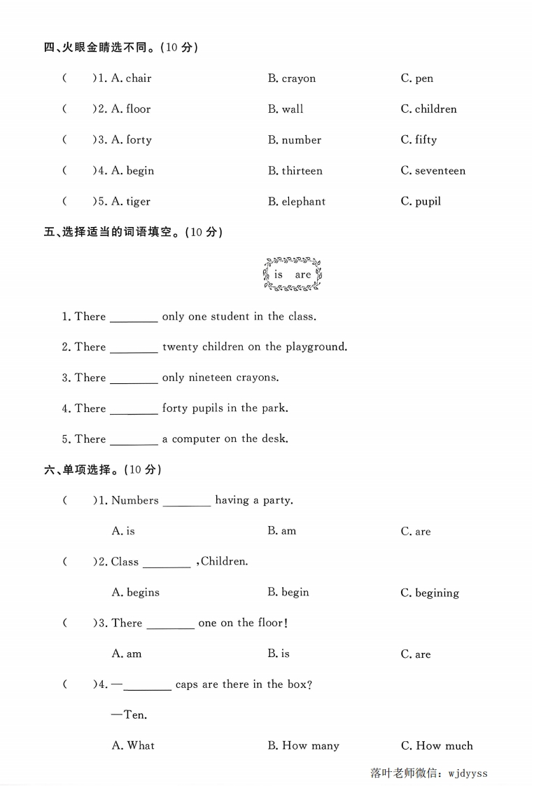 2025外研版五年级英语上册单元测试卷第五单元测试卷(检测时间:60分钟满分:100分)扫码听听万器题序三四五六七八九十总分得分听力部分(30分)一、听录音,选出你所听到的单词或词组。(10分)密)1.A.nineteenB.nineC.ninety簧封)2.A.candyB.crayonC.carry线)3.A.floorB.flowerC.foot)4.A.BritishB.belongC.begin内)5.A.fourB.fortyC.fifty童不二、听录音,为下列图片排序。(10分)】要答三、听录音,判断下列句子与你所听内容是(T)否(F)相符。(10分)靠题)1.Numbers are having a party.)2.How many faces can you see?()3.There are three crayons.But there are four children.()4.All of them are dancing happily.☒()5.There are thirty computers in Park School.把笔试部分(70分)落叶老师微信:wjdyyss