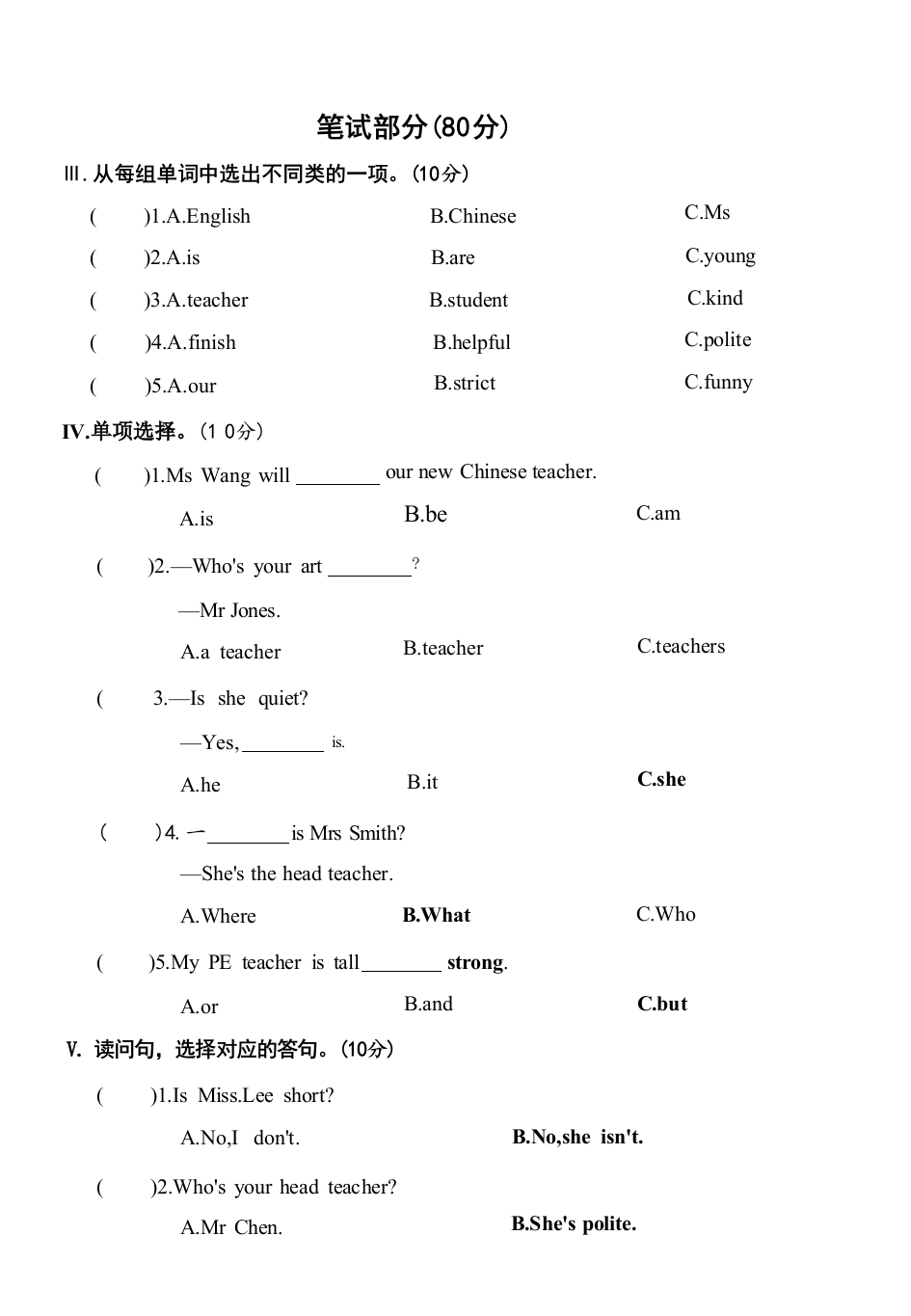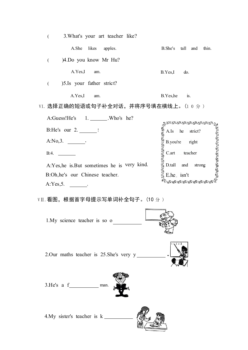 UnitOne测试卷时间:60分钟总分:100分题号11ⅢIVVIVIIVIIIIX总分得分听力部分(20分)可只工.听录音,选出你所听到的单词。(10分)回彩年扫码听录音)1.A.helpfulB.youngC.robot)2.A.oldB.politeC.clever)3.A.funnyB.shyC.know)4.A.kindB.strictC.will)5.A.himB.sometimesC.hard-working川.听录音,选出你所听到的句子。(10分))1.A.Is she quiet?B.Is he old?C.Is she strict?)2.A.Who's your maths teacher?B.Who's your art teacher?C.Who's your science teacher?()3.A.She's very young.B.He's very polite.C.She's very helpful.)4.A.Who's Wu Yifan?B.What's Wu Yifan like?C.Where's Wu Yifan?)5.A.Mr Chen is a maths teacher.B.Mr Grey is a Chinese teacher.C.Miss White is an English teacher.