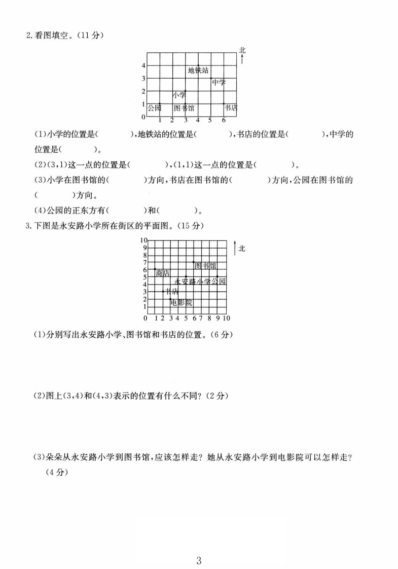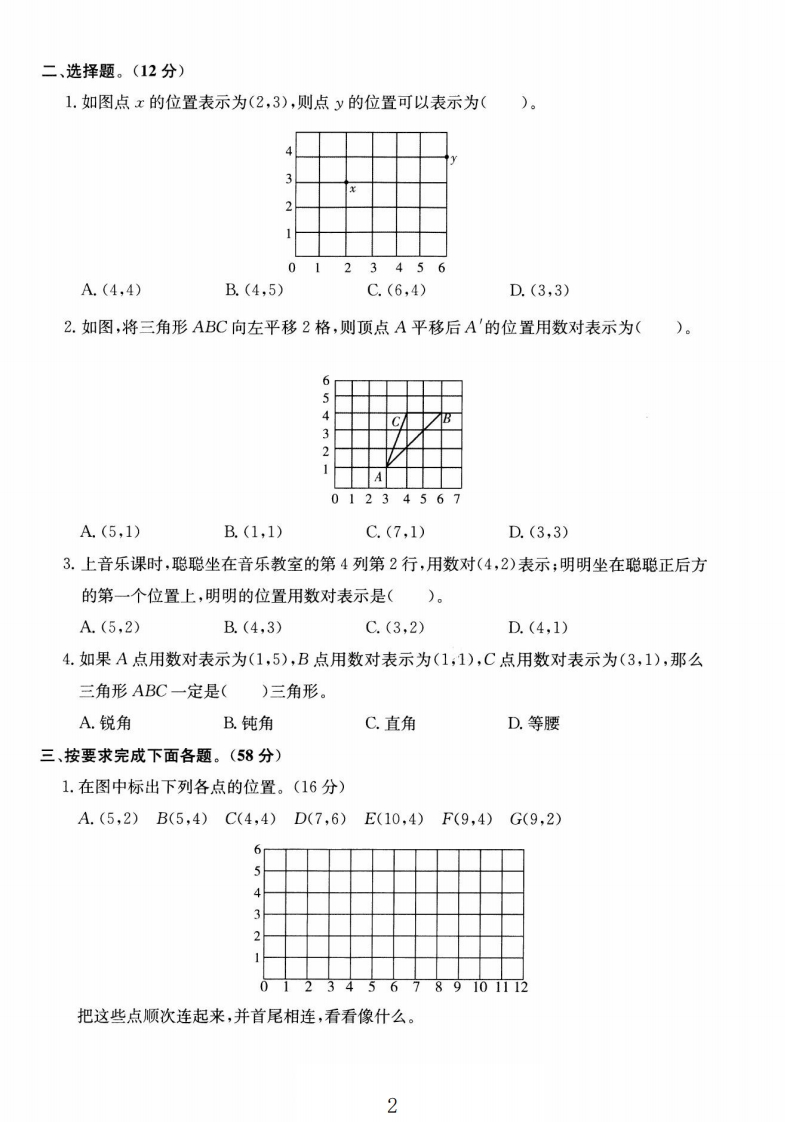 2025五年级上册数学第二单元测试卷第二单元测试卷时间:60分钟满分:100+10分题号三总分附加题等级得分斯一、填空题。(30分)戡1.小军坐在教室的第3列第4行,用(3,4)表示,小红坐在第1列第6行用()来表示,用(5,2)来表示的同学坐在第()列第()行。小红2.(1)请写出图中同学所对应的位置。小'小芳()小兰()小军小节小军()小红(1234(2)如果用(2,4)表示飞飞的位置,用(4,2)表示花花的位置,你能找到吗?请在图中标茶拓出来。3.如下图,苹果的位置为(2,3),则梨的位置可以表示为(),西瓜的位置可以表示为()。梨苹果西瓜45挺4.如图所示,若将A的位置记为(7,1),B的位置记为(5,4),则C、D、E、F的位置依次可记为()、()、()、(6B012345678