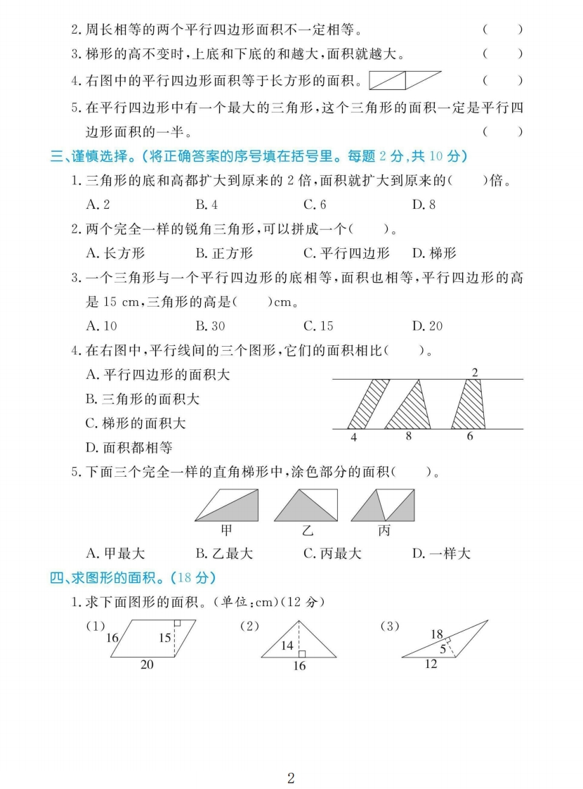 2025北师大版五年级数学上册第四单元测试卷第四单元测试卷时间:90分钟满分:100分家题号二三四五六附加题总分得分一、仔细填空。(每空2分,共18分)密1.一个梯形的上底是4厘米,下底是7厘米,高是5厘米,它的面积是()平方厘米。额封2.下面每个小方格的边长表示1cm,写出每个图形的面积。线内()cm2)cm2薰不3.一个三角形的面积是2.4平方厘米,高是0.8厘米,底是()厘米。4.一个平行四边形的面积是36平方分米,与它等底等高的三角形的面积是要()平方分米。5.工地上有一堆钢管,横截面是一个梯形,已知最上面一层有2根,最下面答一层有12根,每下面一层都要比它上面一层多一根,共堆了11层,这堆钢管共有()根。荞题6.一个直角三角形的面积是10cm2,其中一条直角边是4cm,另一条直角边是()cm.7.一个梯形的上底扩大到原来的2倍,下底也扩大到原来的2倍,高不变,那么它的面积扩大到原来的()倍。8.一个三角形比与它等底等高的平行四边形的面积少30平方厘米,则这个三角形的面积是()平方厘米。☒二、准确判断。(对的画“√”错的画“×”。每题2分,共10分)e1.面积相等的两个平行四边形,一定等底等高。(1