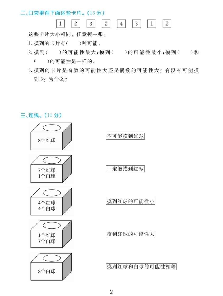 2025人教版五年级数学上册第四单元测试卷第四单元测试卷时间:90分钟满分:100分题号二三四五六附加题总分得分一、仔细填空。(26分)密1.一个正方体,每个面上分别标有数字1~6,掷一次,出现的数字是(的可能性最大;出现的数字是()和()的可能性相等。如封A.双数B.单数C.比3大D.比5小2.足球比赛中裁判用掷硬币的方法来决定哪支球队开球,你认为这种方法线()。A.公平B.不公平内3.桌子上倒扣着三个碗,其中一个碗下有一粒糖,猜一次,()。黨A.猜对的可能性大B.猜错的可能性大不4.在括号里填上“可能”“不可能”或“一定”。(1)明天()有雾霾。要(2)太阳()从西边升起。答(3)地球()绕着太阳转。(4)所有的正方形()有四条边。、题5.下面是玥玥摸球的情况,摸了50次,每次摸出一个后,记录它的颜色,然后放回袋内摇匀再摸。球的颜色红黄蓝次数17726袋内的()球可能最多,()球可能最少,再摸一次,摸出()球的可能性最大。☒6.桌子上有三张卡片,分别标有数字1、2、3,任意拿两张组成一个两位数,得到的数是()的可能性大。eA.奇数B.偶数