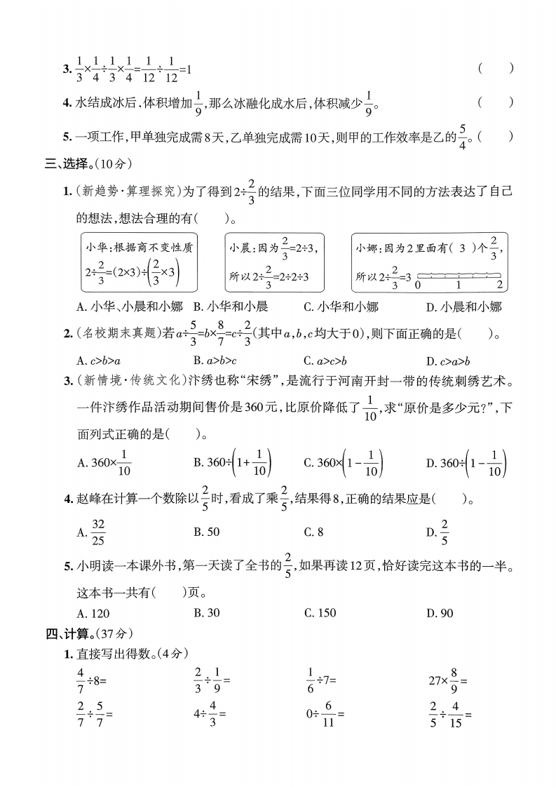 2025-2026学年人教版六年级上册数学综合素养评价第三单元综合素养评价时间:60分钟满分:100+10分题序三四五附加题总分等级龄得分剂一、填空。(每空1分,共23分)1的倒数是),()与0.125互为倒数,()的倒数是它本身,()没有倒数。2.(教材改编)把长,m的绳子平均剪成8段,2段的长度占全长的每段长()mo3.在O里填上“>”“<”或“=”。7.712123.1毁K10510136949×9463*3165-4167v919*179917174.20m是()m的子,12g比()分钟比1小时多兮55,(名校期末真题8kg山茶籽可以榨油)kg,1kg山茶籽可以榨油()kg,榨1kg油需要()kg山茶籽。爵6.(名校期末真题)某工程队用4天时间完成一项工程的413,平均每天完成这项工程的(),照这样的进度,这项工程还要()天才能完成。7元.甲数的号与乙数的日相等,如果乙数是60,那么甲数是(8.如果a,b互为倒数,那么ab+1=()。9.(名校期末真题)小丽和奶奶一起绕着体育馆散步,小丽绕馆一圈需要4分钟,奶奶绕馆一圈需要5分钟。两人同时同地,相背而行,()分钟后相遇。苏諒二、判断。(5分)1.假分数的倒数都小于1。2.(名校期末真题)两个最简分数相除,商一定大于被除数。(