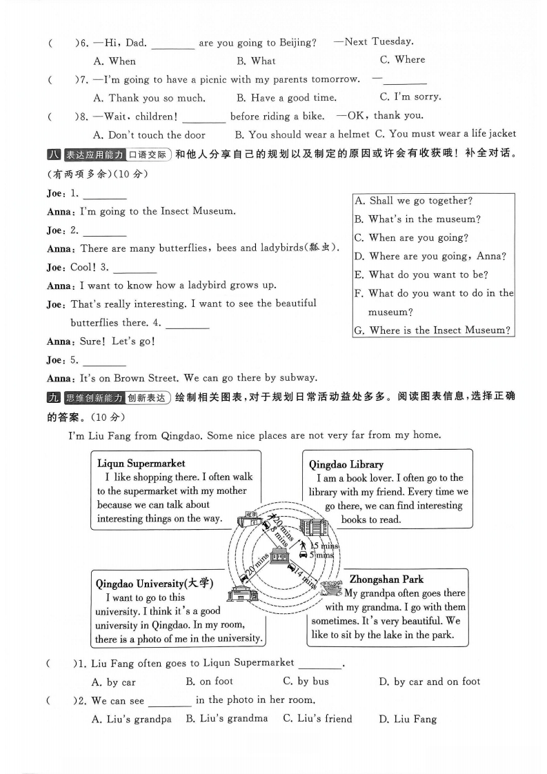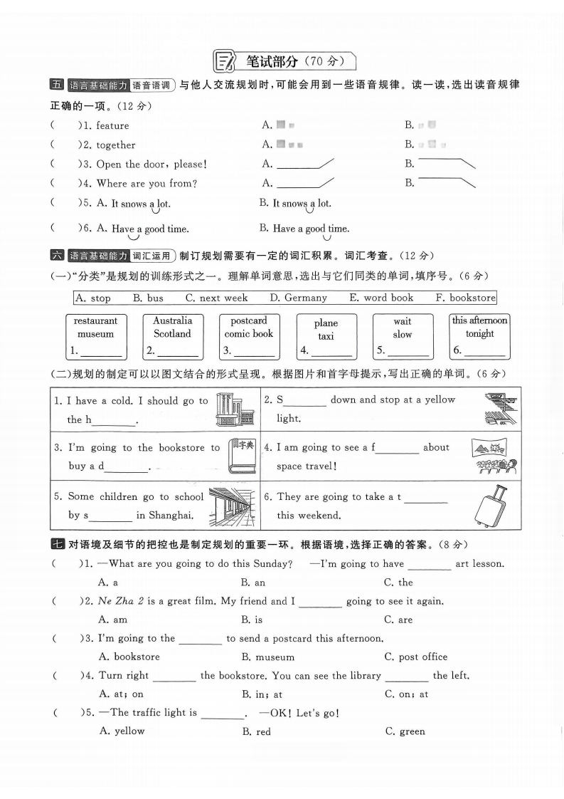 2025-2026学年人教版六年级上册英语素养达标卷期中试卷时间:60分钟满分:100分合理的规划不仅可以节省成本,也可以让生活变得井井有条。你的“规划”能力如何?自测一下是否可以获得“规划小能手”的称号吧!$听力部分(30分)听录音,选出你所听到的词汇。(听两遍)(5分)()1.A.schoolB.restaurantC.supermarketD.hospital()2.A.leftB.straightC.rightD.street弥资)3.A.by subwayB.on footC.by planeD.by ship)4.A.stopB.slowC.waitD.step)5.A.musicB.museumC.gymD.milk日理解分析能力信息提取听录音,判断图片与所听内容是(T)否(F)相符。(听两遍)(⑤分)1.3毁目听录音,选择正确的选项。(听两遍)(10分)听第一段对话,完成第1一2小题。()1.The girl wants to go to theA.bookstore B.shoe storeC.cinema)2.The girl can take theto get there.A.No.5 bus B.No.15 bussC.No.50 bus听第二段对话,完成第3一5小题。()3.What is John going to buy in the toy shop?线A.A toy bus.B.A toy cat.C.A toy car.()4.When is John going to the post office?A.On Saturday morning.B.On Sunday morning.C.On Sunday afternoon.)5.John is going to the post officeA.by taxiB.by carC.by subway四思维创新能力实践应用听录音,填写正确的单词或短语,补全地图。(听三遍)(10分)bankparkhospital52.library