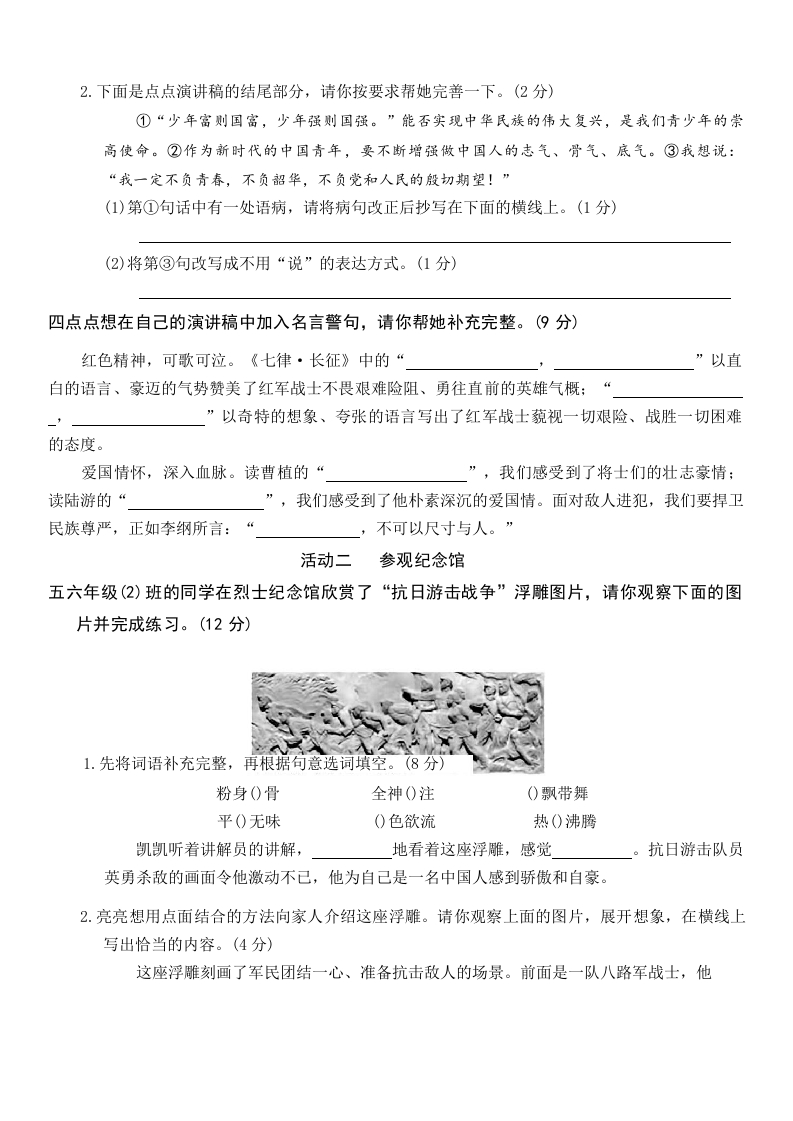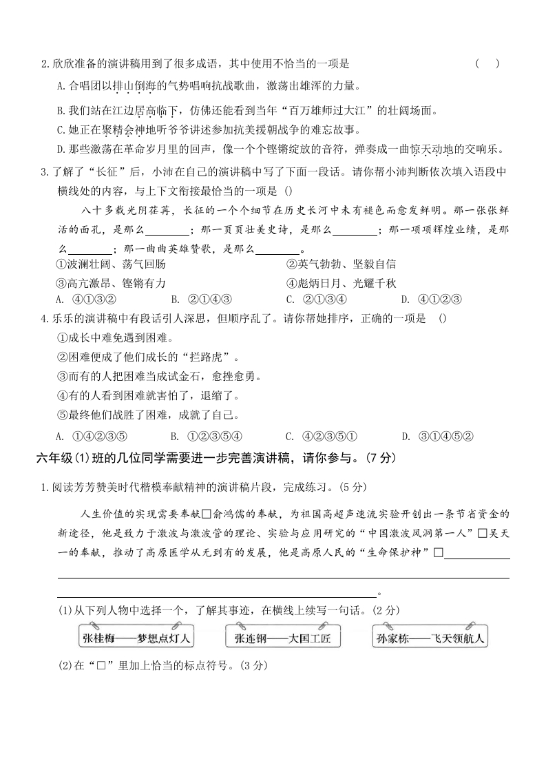 2025-2026学年六年级上册语文情境主题卷第一次月考卷时间:90分钟满分:100分为了培养家国情怀,六年级开展了以“忆峥嵘岁月,赞时代楷模”为主题的系列活动,主要有演讲比赛、参观烈士纪念馆、阅读交流会等。请你也积极参与吧。活动一演讲比赛新趋势语段综合李老师一边安排演讲比赛的准备工作,一边指导同学们写演讲稿。请你阅读甜甜的演讲稿片段,完成练习。(14分)什么是理想?理想是“两弹一星”功勋奖章获得者于敏以bùdqū0不挠的精神pāndēng(0科学高峰,实验成功后即使不能uān0之于众也仍感xǐyuè0的纯粹:是老英雄张富清60多年深藏功名,一辈子艰苦fen zhàn0,格守初心践行那zhǎn dTngjiétiě0般的誓言:是泳坛名将张雨霏把国家责任扛在肩上,探索运动极限,在逆境中崛起的gǎnrén0瞬间:是航天员王亚平在太空中tià0wàg)美丽祖国的深情目光…每位践行理想的英雄都是中华民族最的坐标,我们要用最的歌声赞美他们,用最的胸怀拥抱他们。1.甜甜有几个字词不会写,请你帮她根据拼音写在相应的括号里。(8分)2.依次填入片段中横线处的词语,最恰当的一项是(2分)()A.明亮闪亮散亮B.闪亮嘹亮散亮C.亮丽嘹亮明亮D.闪亮鲜亮清亮3.模仿片段中画“一一一”的短语,在括号中填写恰当的表示“看”的词语。(不重复)(2分)0清凌凌的湖面0高大的人民英雄纪念碑4.李老师说:“作好演讲,演讲稿必须有说服力。大家认为怎样的演讲稿才有说服力和感染力呢?”同学们踊跃发言。请你判断下列发言的对错,对的打“”,错的打“×”。(2分)()丽丽:“观点鲜明,感情真挚,能给人以可信性和可靠感。”()(2)亮亮:“要选择合适的材料说明观点,如,列举有代表性的事例,引用名言警句。”0(③)点点:“要有感染力,可以引用生动的故事。”()(4)甜甜:“演讲时根据听众的反应,可以随时调整主题。”()同学们在李老师的指导下认真准备自己的演讲稿,请你帮他们解决遇到的难题,选择正确的答案。(填序号)(8分)1.珊珊准备的演讲稿中用到了很多生字,她标出的读音中有误的一项是()A.羞涩(s)迂回(yū)电钮(ni)B.参差(can)围歼(qian)叽里呱啦(gua)C.崎岖(qu)妩媚(wi)憧憬(jing)D.干涸(he)烟渚(zhi)千钧一发(jn)