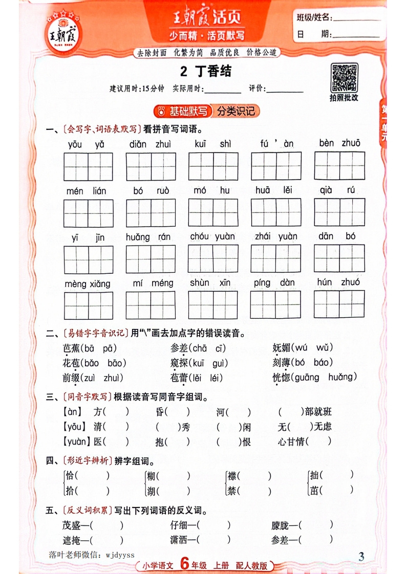 王朝酸王朝霞活页10去除封面化繁为简品质优良价格公道采用80g品總纸令背金言推后。2025秋小学语文年级上册配人教版少而精活贡默写朝霞文化产品研发中心编|第一单元1草原建议用时:15分钟实际用时:评价:8基础默写分类识记一、〔会写字、词语表默写〕看拼音写词语。bōshao weiditanyi shangcai hongmǎtidoufuxiantiaorouměijingtanimaosǎtuohui weimùdidijoshùjǔbeigǎnrenrehuhu二、〔易错字字音识记)用“√"画出加点字的正确读音。勾勒(Ièilè)羞涩(se she)渲染(Xudnxuan)迂回(y0yu)陈旧(cnchen)蒙古包(mengměng)落叶老师微信,widvyss小学语文6年级上册1配人教版