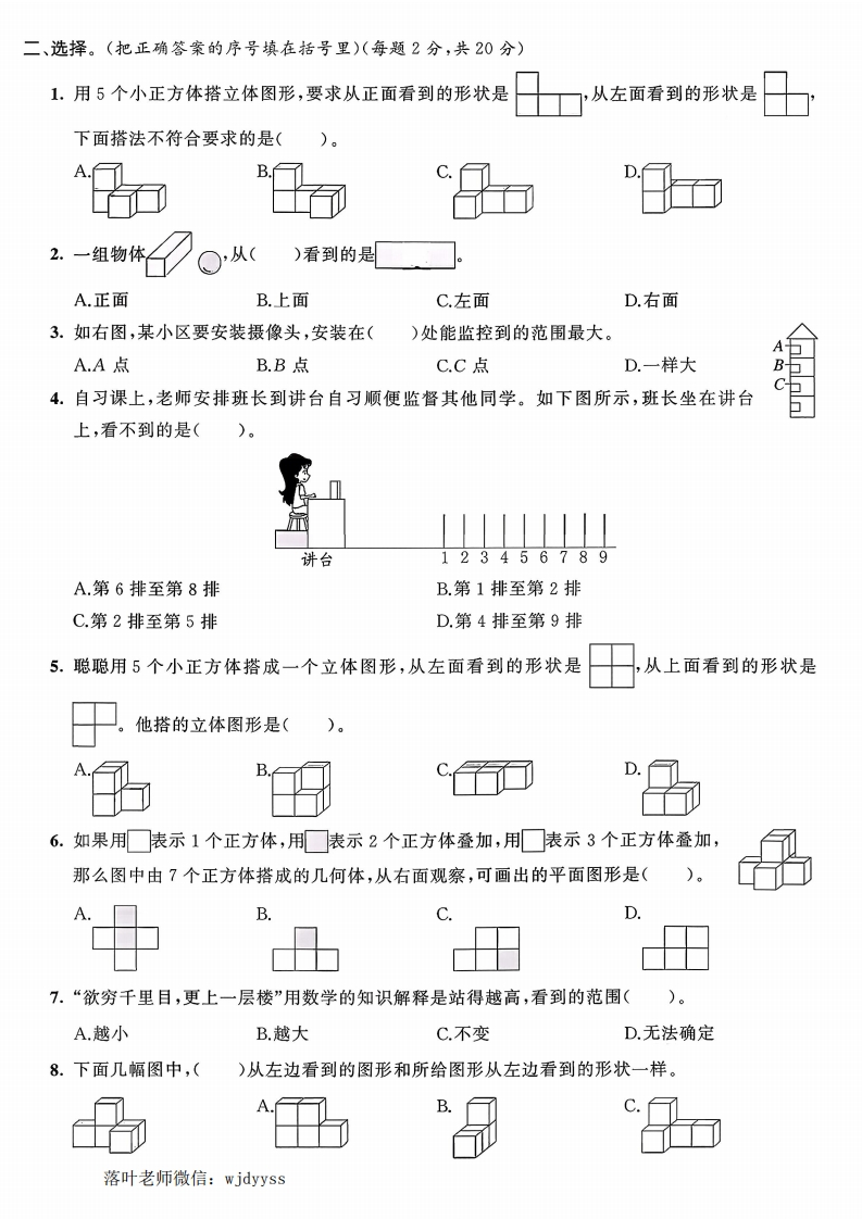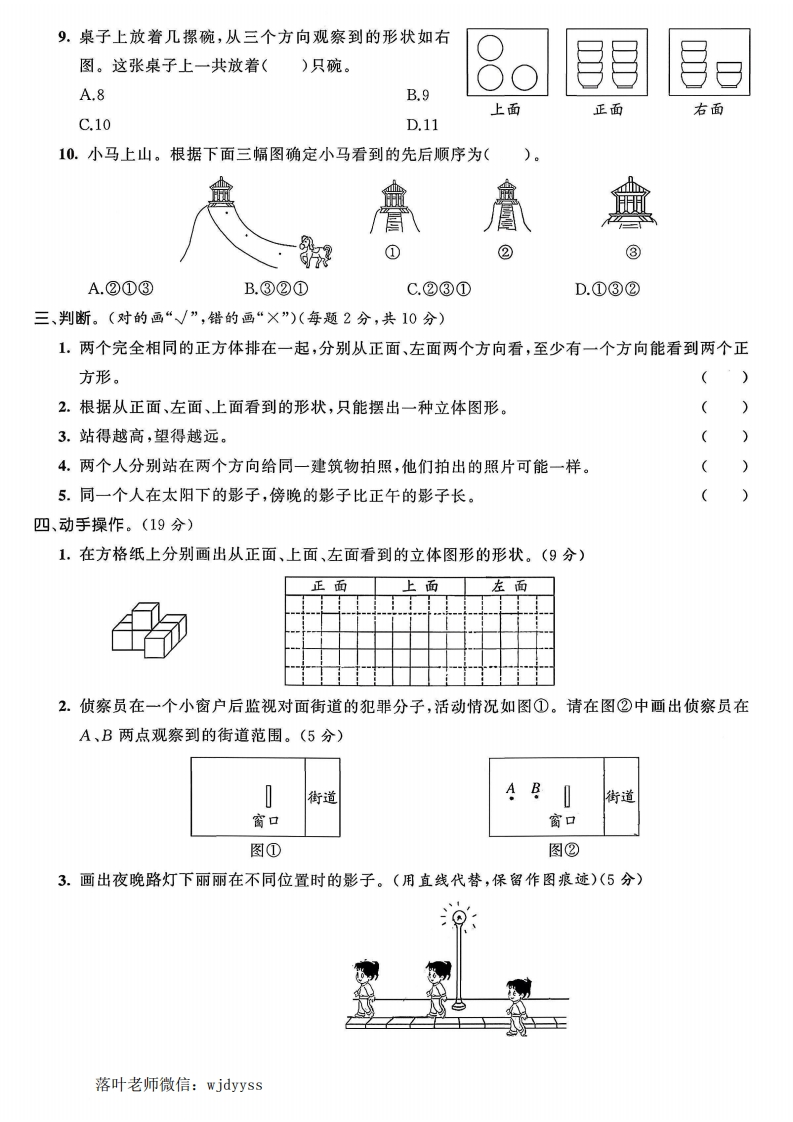 2025北师版六年级上册数学综合提优测试卷第三单元综合提优卷题号四五六总分得分时间:70分钟满分:(100+10)分一、填空。(每空2分,共26分)1.王老师家所在的公寓前是一个停车场,王老师住的楼层越高,看到他家的汽车就越()。(填“大”或“小”)2.聪聪和亮亮身高一样高,可是他俩站在同一盏路灯下,聪聪的影子却比亮亮长,这是因为聪聪离这盏路灯()。(填“远”或“近”)3.观察一个长方体形状的物体,一次最多能看到()个面。4.一个立体图形,从上面看到的形状是从正面看到的形状是搭这样的立体图形,至少需要()个小正方体,最多可以有()个小正方体。封5田田国B线如上图,乐乐站在A点看到的是(),他站在B点看到的是(6.苹苹在A,B,C三个位置给下面两个物体拍照。照片是在位置()拍的。B照是在位置()拍的。7.添一个小正方体,使从正面看形状不变,有()种添法。(小正方体之间至少有一个面重合)8.壮壮和鹏鹏分别站在教学楼的二楼和四楼的走廊上向外看,()比()看到的外界事物多一些。9.学校的阶梯教室做成阶梯形的原因是(落叶老师微信:wjdyyss
