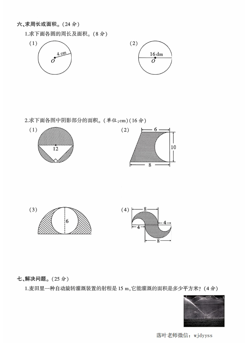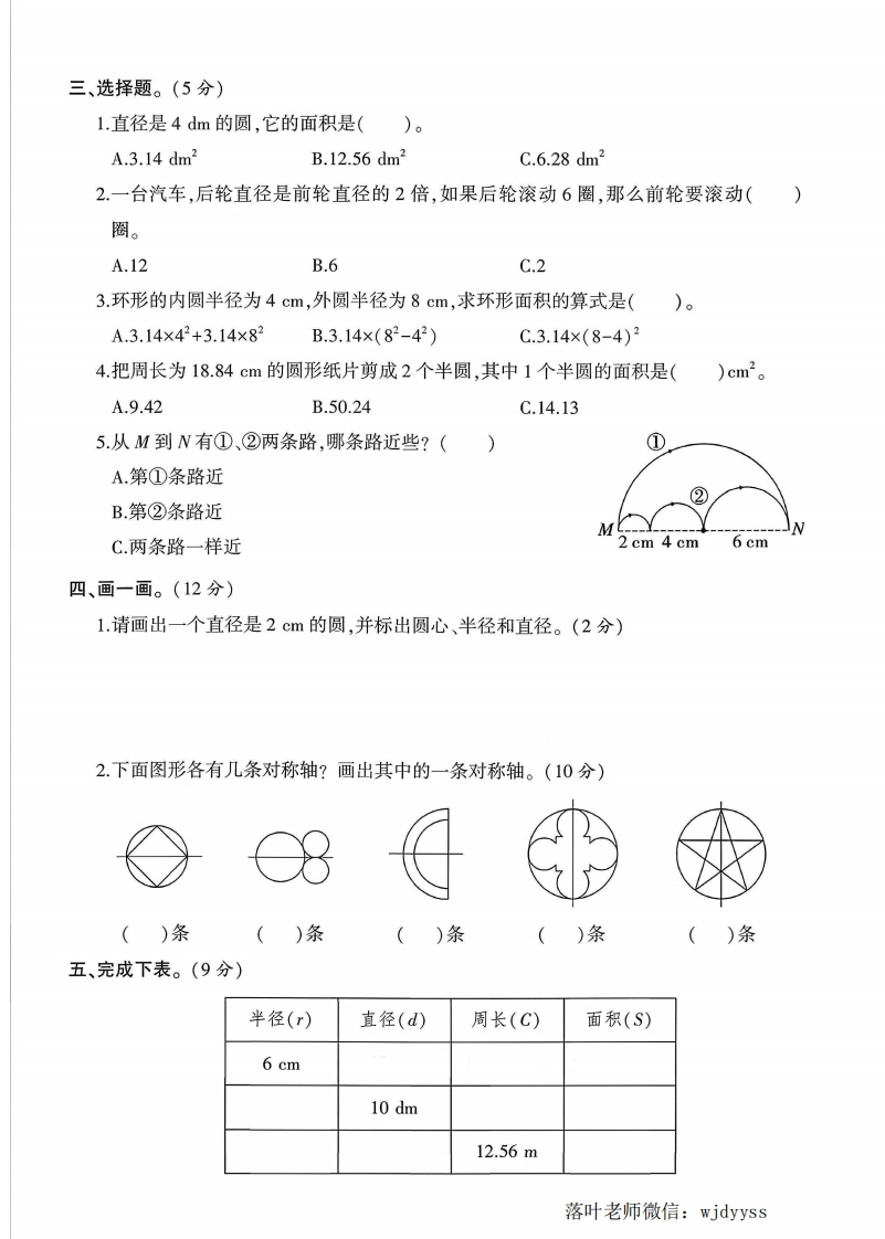 2025北师大版六年级数学上册单元测试卷第二单元测试卷郭检测时间:90分钟满分:100分+10分题序二三四五六七附加题总分得分一、填空题。(每空1分,共20分)弥1.圆是轴对称图形,有()条对称轴,每一条()所在的直线都是它的对称轴。2.直径为14cm的圆,它的周长是()cm,面积是()cm2。毁封3.一个直径是6cm的圆,半径是()cm;一个周长是25.12cm的圆,半径是()cmo圆的半径是(),圆的直径是(),4.线3cm圆的周长是(),圆的面积是()。5.m3.14、73.14四个数按从大到小的顺序排列是()>()>()>()内6.一个圆的半径扩大到原来的2倍,它的周长就扩大到原来的()倍,面积就扩大到原童不来的()倍。7.你能利用方格估计下图中的面积吗?1 cm要答荞题圆的面积大约是()个小方格。圆的面积大约是()cm2。8.一个正方形和一个圆的周长都是6.28dm,正方形的面积是()dm2,圆的面积是()dm2。二、判断题。(对的画“V”,错的画“X”)(5分)1.直径是半径的2倍。(2.圆的周长越长,它的面积就越大。()☒3.圆周率π就是3.14。()4,车轮滚动一周的路程正好等于车轮的面积。(e5.把一张圆形纸片按不同的方向多次对折,折痕都经过圆心。(落叶老师微信:wj