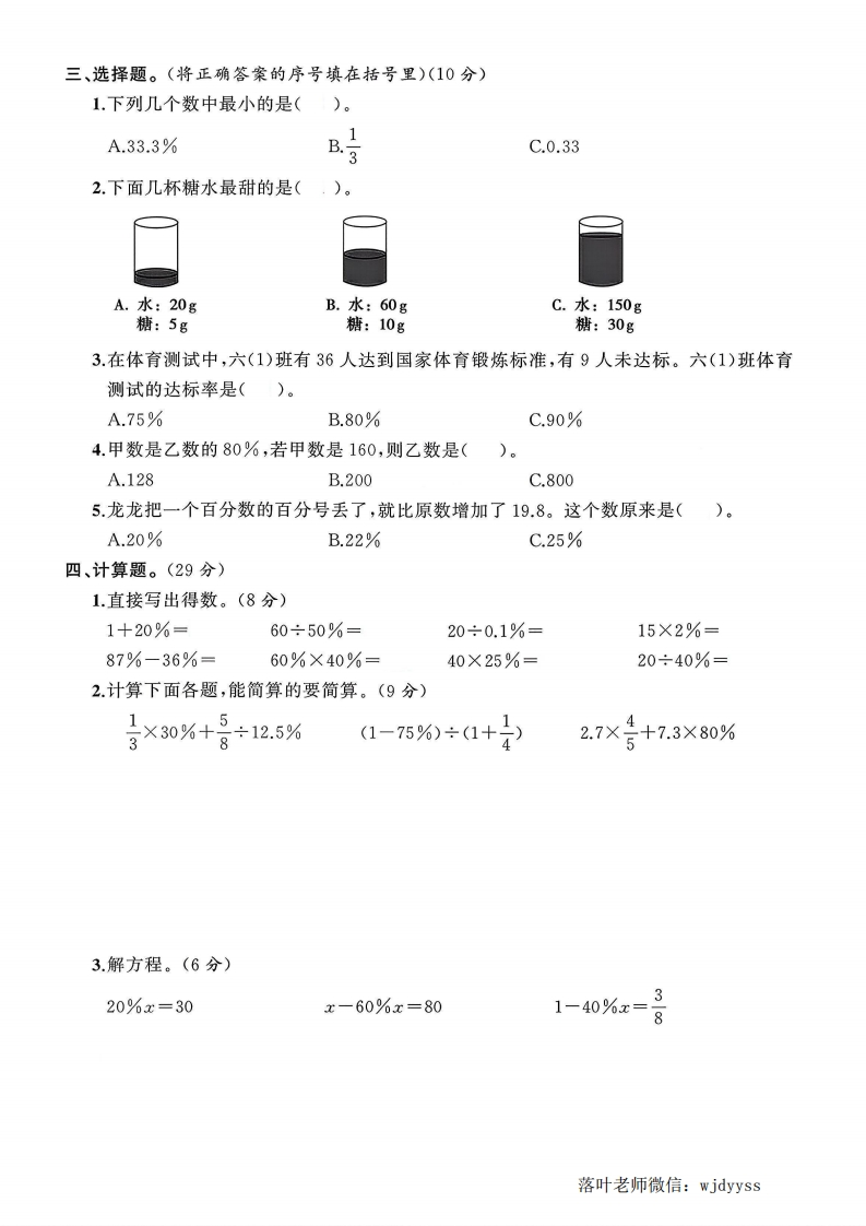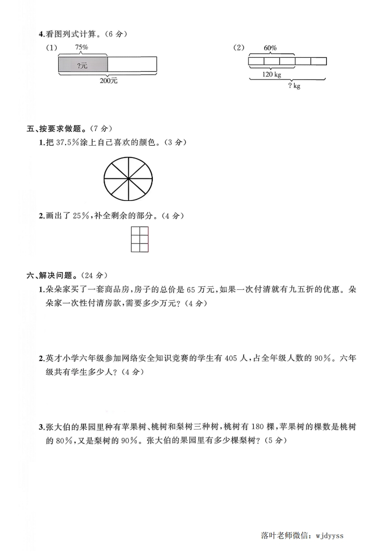 2025北师大版六年级数学上册单元测试卷第四单元测试卷时间:90分满分:100分+10分题序二三四五六附加题总分得分一、填空题。(每空1分,共20分))=(1.12÷(5)=()%=()(填小数)=()折。弥252.45m的60%是()m;()kg的20%是80kg。3.一批货物,第一次运走写,第二次运走25%,两次共运走这批货物的()%,还剩下封希这批货物的()%。4把5g盐溶于20g水中,盐水的含盐率是()。线5.一瓶品牌酒的外包装上标记:酒精含量52%,净含量500mL。一瓶这种酒中含纯酒精(260)mL.6.抽样检测一种产品,47件合格,3件不合格。这种产品的合格率是()%,照这样计内算,生产2500件这样的产品,不合格的产品有()件。7.把一根长4m的木料平均锯成若干小段,共锯了4次,每段长()m,每段是全长的不()%。8.思涵的储钱罐里有1元硬币45枚,占储钱罐里总钱数的37.5%。思涵的储钱罐里共有要()元。9.商场里有一件毛呢大衣打七折出售,妈妈看中了这件大衣并付给销售员300元,销售员找给妈妈20元。这件毛呢大衣的原价是()元。答10.一桶油用去了25%,还剩15L,这桶油原来有()L。阳11.“双十一”时,一自行车行所有自行车打九折促销。一辆自行车的原价是1520元,打折题后是()元。另一辆儿童折叠自行车打折后是270元,这辆儿童折叠自行车原价是()元。二、判断题。(对的画“√”,错的画“X”)(10分)1.一个数的60%是90,这个数是150。()2.成语“百发百中”用数学语言表示为命中率是100%。()☒3.一件衣服打八折出售就是指这件衣服比原价便宜80%。()4.甲数的60%等于乙数的75%(甲、乙两数均不为0),那么甲数<乙数。(:5.六(1)班和六(2)班的男生人数都占全班的48%,六(1)班和六(2)班的男生人数一定相等。)落叶老师微信:wjdyyss