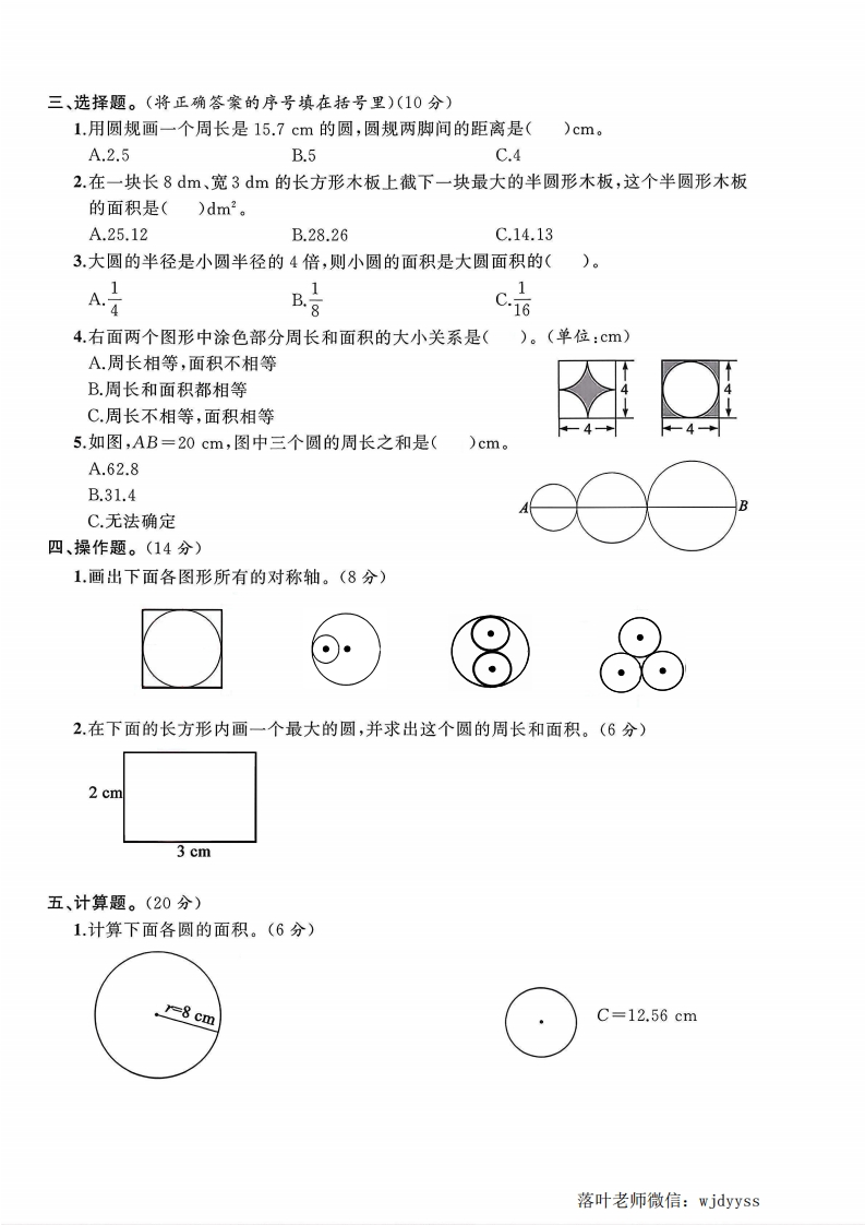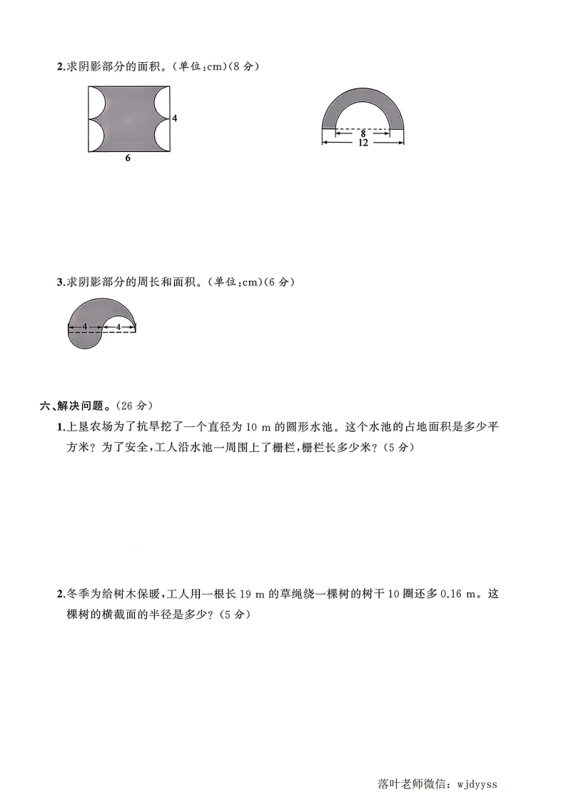 2025北师大版六年级数学上册单元测试卷第一单元测试卷时间:90分钟满分:100分+10分题序二三四五六附加题总分得分剂一、填空题。(每空1分,共20分)1.用圆规画一个圆,如果圆规两脚间的距离是3cm,这个圆的周长是()cm,面积弥是()cm2。2.一个半圆形花坛的直径是6m,这个花坛的周长是()m,面积是()m2。3.一个圆的周长是31.4dm,它的半径是()dm,面积是()dm2.封靠4.有一个挂钟,分针长8cm。从12时到1时,分针尖端走了()cm,分针扫过的面积是()cm2。线5.如图,一个半圆的周长是()cm,一个整圆的面积是()cm2。内6.一个环形的外圆半径和内圆直径都是10cm,这个环形的面积10 cm是()cm2。7.一个圆的半径扩大到原来的3倍,它的直径会扩大到原来的()倍,周长会扩大到原餐不来的()倍,面积会扩大到原来的()倍。..8.小强以每分钟62.8m的速度绕一个圆形体育场步行一周,恰好用了5分钟。这个体育要场的周长是()m,面积是()m2。9.将一块边长是4dm的正方形铁皮剪成一个最大的圆,这个圆的周长是()dm,剩下的边角料的面积是()dm2。答10.金山公园新建了一个直径为100m的圆形人工湖,如果湖边每隔2m种一棵风景树,毁一共需要栽()棵风景树。题11.如图,圆的面积和长方形的面积相等。已知圆的半径为6cm,那么长方形的周长是()cm。二、判断题。(对的画“√”,错的画“X”)(10分)1.直径一定大于半径。2.圆有无数条对称轴,半圆也有无数条对称轴。(风-有)元:3.圆的周长是它的直径的π倍。4.圆的面积越大,周长也就越大。5.周长相等的长方形、正方形和圆,圆的面积最大。落叶老师微信:wjdyyss