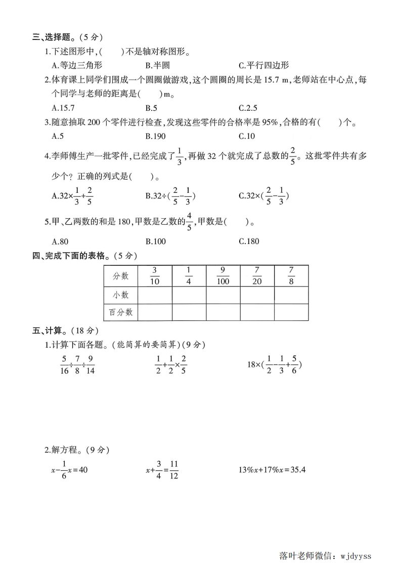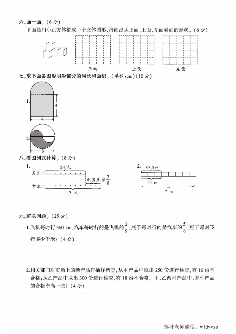 2025北师大版六年级数学上册期中测试卷期中测试卷器检测时间:90分钟满分:100分+10分题序三四五六七八九附加题总分得分、填空题。(每空1分,共18分)弥1.一个半径是5cm的圆,周长是()cm,面积是()cm2。2.60km增加它的0后是()km;()吨比55吨少1毁封3.离窗越远,看到窗外的范围就越(左图中,每个圆的周长是(线)cm,面积是()cm2。8 cm5红领巾小学上学期有500人,这学期学生人数减少了5,这学期红领巾小学还有内)人。童不6.在0.349.696、,3.3%和写中,最大的数是(),最小的数是()o7.科技小组进行大豆种子发芽实验时,用200粒种子进行实验,有8粒没有发芽,发芽率要是()%。128.()÷25=0.24=)=()%。答口这两个立体图形从()面看到的形状是相同的,从(茶题面和()面看到的形状也是相同的。10.一个圆环,内圆直径是8cm,环宽1cm,这个环形的面积是()cm。二、判断题。(对的画“√”,错的画“X”)(5分)1.两个半圆一定能拼成一个整圆。2.观察物体时,只需要观察一个面,就知道该物体是怎样搭建的。3.一桶油第一次用去了25%,第二次用去了5两次共用去了456。(☒4如果ax+bx=7,那么a+6=49。e5.小圆的直径和大圆的半径相等,大圆面积是小圆面积的2倍。(落叶老师微信:wjdyyss
