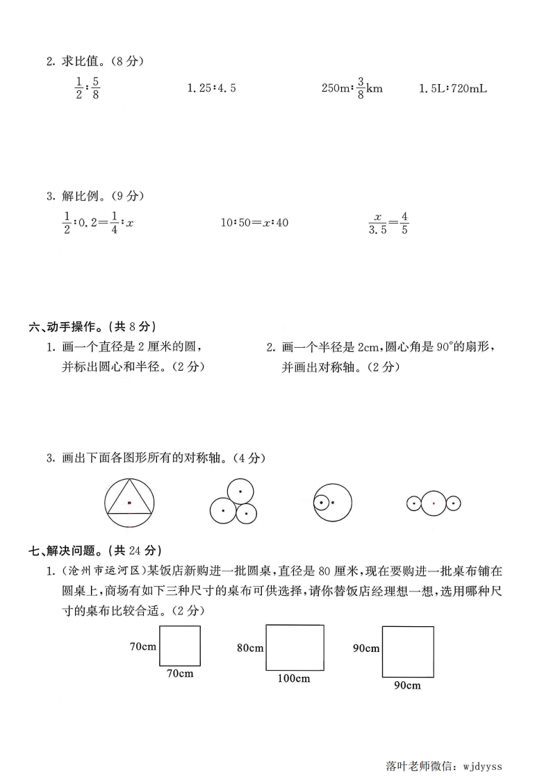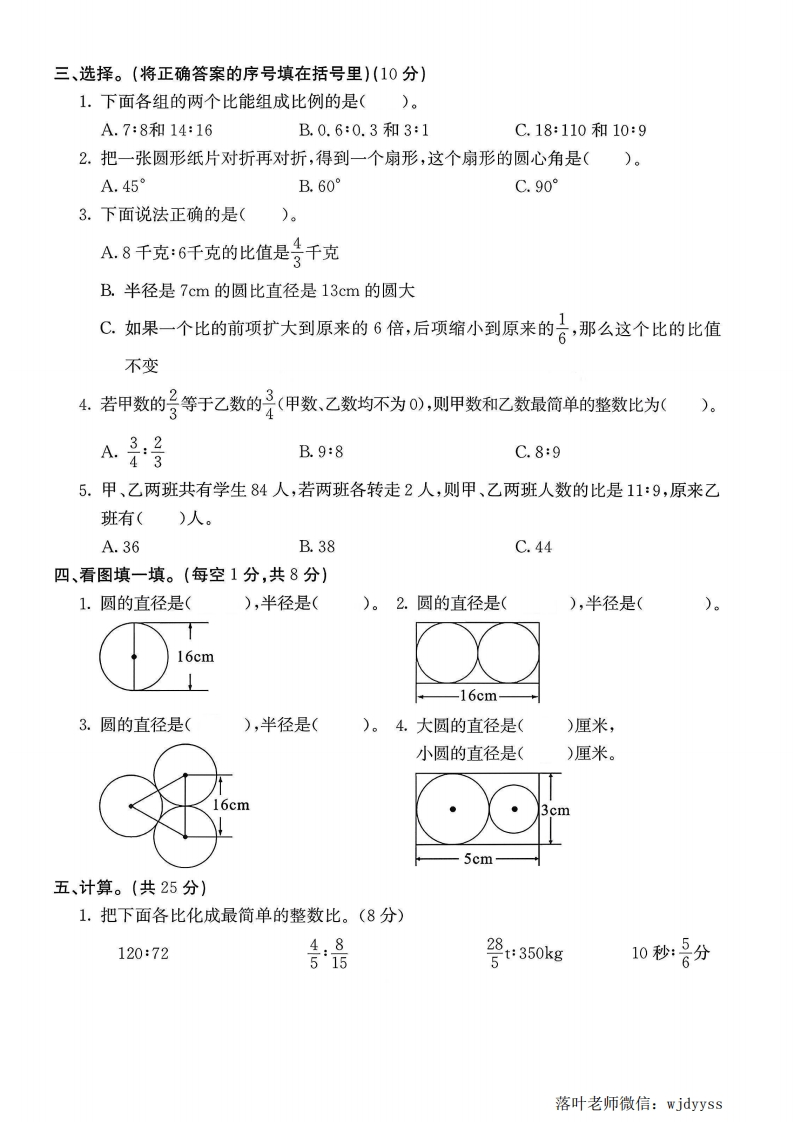 2025冀教版六年级数学上册单元测试卷第一、二单元综合测试卷(时间:90分钟分数:100分)一、填空。(每空1分,共20分)1.同一个圆中,可以画出()条直径和半径,所有的直径都(),所有的半径都(),直径等于半径的()倍。2.扇形的大小与半径有关,也与()的大小有关。3.要画一个直径是3厘米的圆,圆规的两脚应叉开()厘米;当圆规的两脚叉开3厘米时,所画圆的直径是()厘米。4.一个三角形,它的三个角的度数比为1:2:1,按角分,它是()三角形。5.王老师用180张纸,订了5本本子,用的纸的张数和所订的本子数的比是(这个比值表示的意义是()。n6.用4、6、8、12四个数,写出两组不同比值的比例,分别是()和(有)。7.在一个边长是8cm的正方形中,画一个最大的圆,圆的直径是()cm,在一个长10cm,宽6cm的长方形中画一个最大的圆,圆的半径是()cm。8.一段路,甲用8小时走完,乙用6小时走完,甲和乙所用的时间比是(),甲和乙的速度比是()。9.一个比是3:8,如果比的前项扩大到原来的3倍,要使比值不变,后项应扩大到原来);如果前项加上15,要使比值不变,后项应加上(叔的()。10.用45cm长的铁丝围成一个等腰三角形,已知腰和底的长度比是4:1,那么这个等腰三角形的腰长是()cm,底长是()cmo常二、判断。(对的画“/”,错的画“X”)(5分)】1.直径4厘米的圆与半径2厘米的圆一样大。(2.一个圆的直径是这个圆的一条对称轴。3.马既可以表示比,也可以表示比值。图4.比的前项和后项同时乘或除以相同的数,比值不变。5.在1千克水中加入10克盐,盐和盐水的比是1:10.(落叶老师微信:wjdyyss