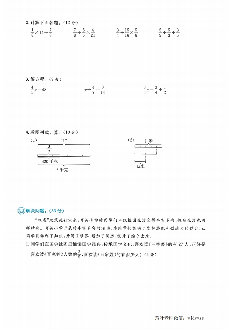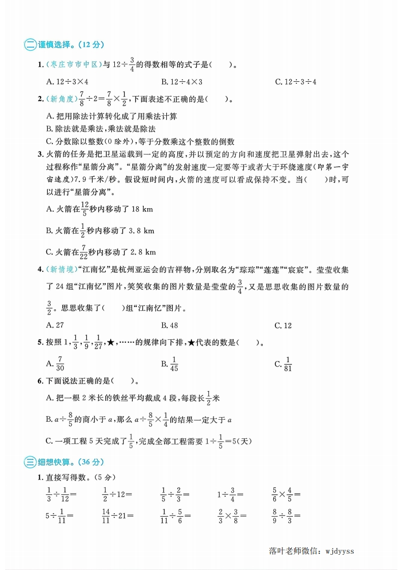 2025青岛63制六年级数学上册单元测试卷第三单元测试卷密⊙测试时间:60分钟⊙满分:100分十卷面:5分评价毁⊙仔细填空。(19分)1.号÷4是把号平均分成()份,求每份是多少,也就是求多的()是多少,所以÷4=号×()。2.千克是千克的(),()米的号是60米。蜜3.由中国中车承担研制、具有完全自主知识产权的高速磁浮交通系统在青岛成功下线,标志着我国掌握了高速酸浮成套技术和工程化能力。该车号小时可行驶400千米,该车每封小时行驶多少千米?列式计算为()。4.(新情境)第一只在国外出生并回国的大熊猫是“华美”,截至目前,它已经拥有了14只大熊猪幼崽。“华美”的大熊猜幼崽只数是2023年回国的大熊猫“永明”的?。大熊猎“水明”共拥有()只大熊猫幼崽。5.是吨大豆可以榨油)吨,平均每吨大豆可以油()吨,榨1吨油需要()吨大豆。6.在○里填上“>”“<”或“=”。3÷2○3÷1O×17.三国周瑜,而立之年已是东吴大都督,未到不惑之年就英年早逝。已知他去世时年龄的十位上的数字是个位上的,那么周瑜去世时是()岁。章线8.在算式号÷a(a>0)中,当a()1时,商大于9;当a()1时,商等于9;当a()1时,商小于号。(填“>”“<”或“=”)9.甲数的写与乙数的号相等;如果甲数是90,那么乙数是()。10.(☆)一个三角形的底是号米,高是受米,这个三角形的面积是()平方米。落叶老师微信:wjdyyss
