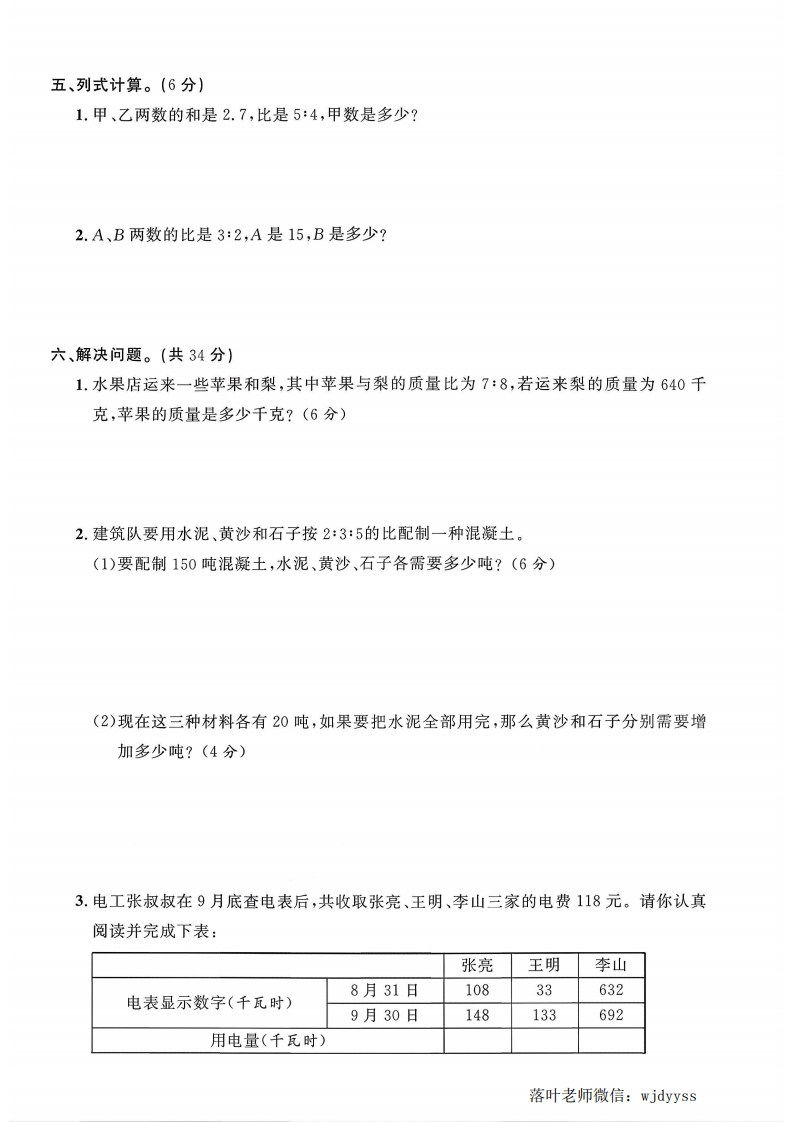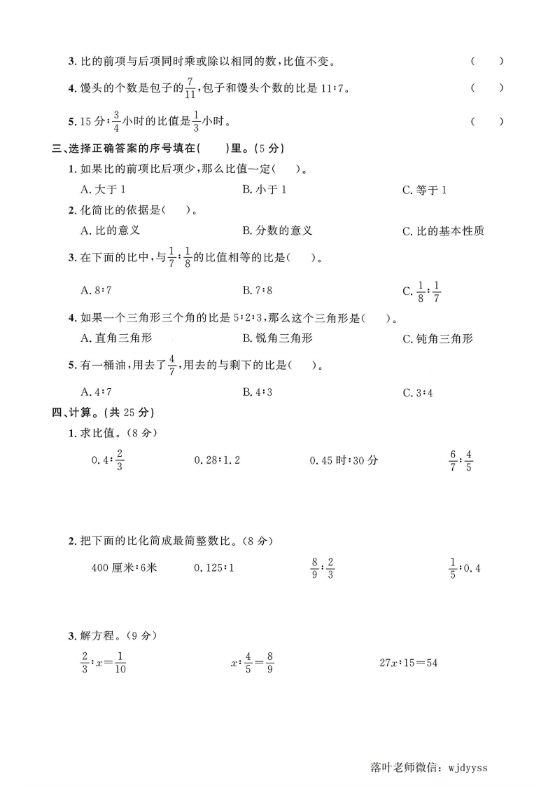 2025青岛63制六年级数学上册第四单元测试卷第四单元测试卷(检测时间:90分钟满分:100十10分)题序三四五六附加题总分得分一、填空。(每空1分,共25分)1.六(1)班有男生26人,女生24人,男生与女生人数的比是(),女生与全班人数密的比是(),男生占全班人数的()。報封2.()÷5=6:10=(15)=97=():15。3.正方形的周长与边长的比是(),比值是()。线4.在3:2这个比中,如果前项加上6,要使比值不变,后项应乘()。5.如果8A=9B(A、B均不为0),那么A:B=(内6.一个比的前项是号,比值是2,后项是(7.将5克盐溶解在50克水中,盐和盐水质量的比是()。不80.2:号化成最简整数比是(),子时:15分的比值是(要9.已知两个数的比是12:25,把它化成后项是100的比是(),若把它的前项扩大到原来的3倍,则后项应加上(答10.甲数是乙数的号,则甲数与乙数的最简整数比是(),若甲数是10,乙数是()。彩题11.一个直角三角形的两个锐角的度数比是2:1,这两个锐角的度数分别是()和()。12.有150本图书,按1:2:3分配给四、五、六三个年级,五年级分得这批图书的(一),分得()本。13.用28厘米的铁丝围成一个等腰三角形,已知腰和底的长度比是3:1,则腰长()厘米,底长()厘米。☒二、判断:对的打“√”,错的打“X”。(5分)1.比的前项和后项都不能为0。e2号可以读作五分之三,也可以读作三比五。()落叶老师微信:wjdyyss