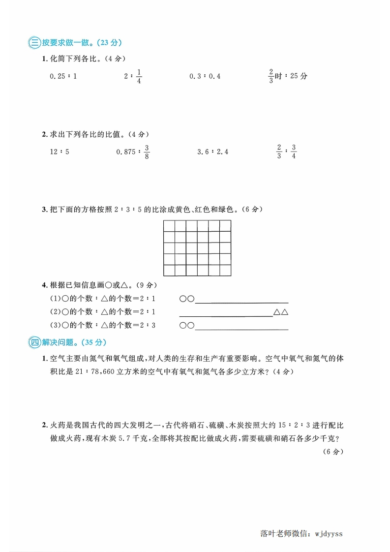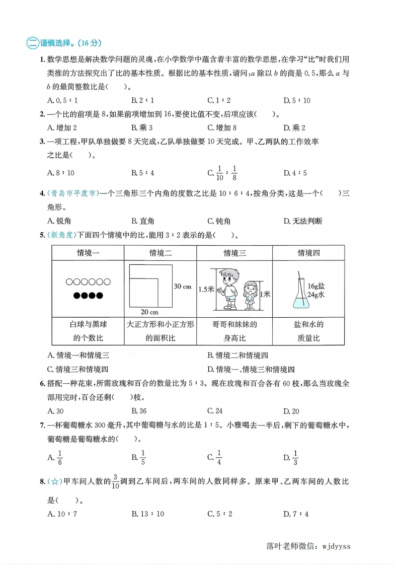 2025青岛63制六年级数学上册单元测试卷第四单元测试卷密⊙测试时间:60分钟⊙满分:100分十卷面:5分评价毁白仔细填空。(26分)1.甲、乙两辆汽车,甲车4小时行驶了200千米,乙车3小时行驶了180千米。甲车行驶的路程与时间的最简整数比是(),比值是();甲、乙两车行驶的时间比是(),甲、乙两车速度的最简整数比是()。2.(潍坊市安丘市)号=12:()〈25=()÷40=()(填小数)蜜3.晨晨看一本书,已看页数与剩下页数之比是5:3。已看页数是剩下页数的};剩下页数是已看页数的号;已看页数占全书的号剩下页数占全书的:封4号:4的比值是),如果前项乘3,要使比值不变,后项应扩大为原来的()倍;如果后项加上4,要使比值不变,前项应变为()。5.(新情境)在人类进化过程中发生的显著变化是脑容量的增加。几百万年前的南方古猿的脑容器量约为460毫升,而现代人的平均脑容量约比南方古猿多940毫升。南方古猿与现代人脑容量的比是(),比值是()。6.一个等腰三角形,顶角和底角的比是4:3,顶角是()度,底角是()度。7.(德州市临邑县)把11克盐溶解在100克水中,盐与盐水的比是(),水占盐水的《弓盐与水的比是()。8.(青岛市平度区)从2、5、8、15中选择两个数组成一个比。(1)比值最小的比是()。肇线(2)比值是号的比是(9.当人体上半身和下半身长度的比值为0.618时,会给人一种优美的视觉感受,这个神奇的比被称为“黄金比”。有一位阿姨上半身长61.8厘米,下半身长95厘米,按此黄金比,她应该选择高度为()厘米的高跟鞋。10.(☆,改编题)两桶水共17升,小桶的水喝掉1升后,剩下的与大桶中水的比是1:3,小桶中原来装有()升水。落叶老师微信:wjdyyss