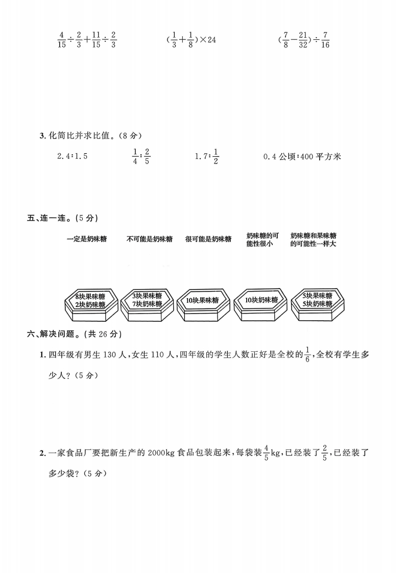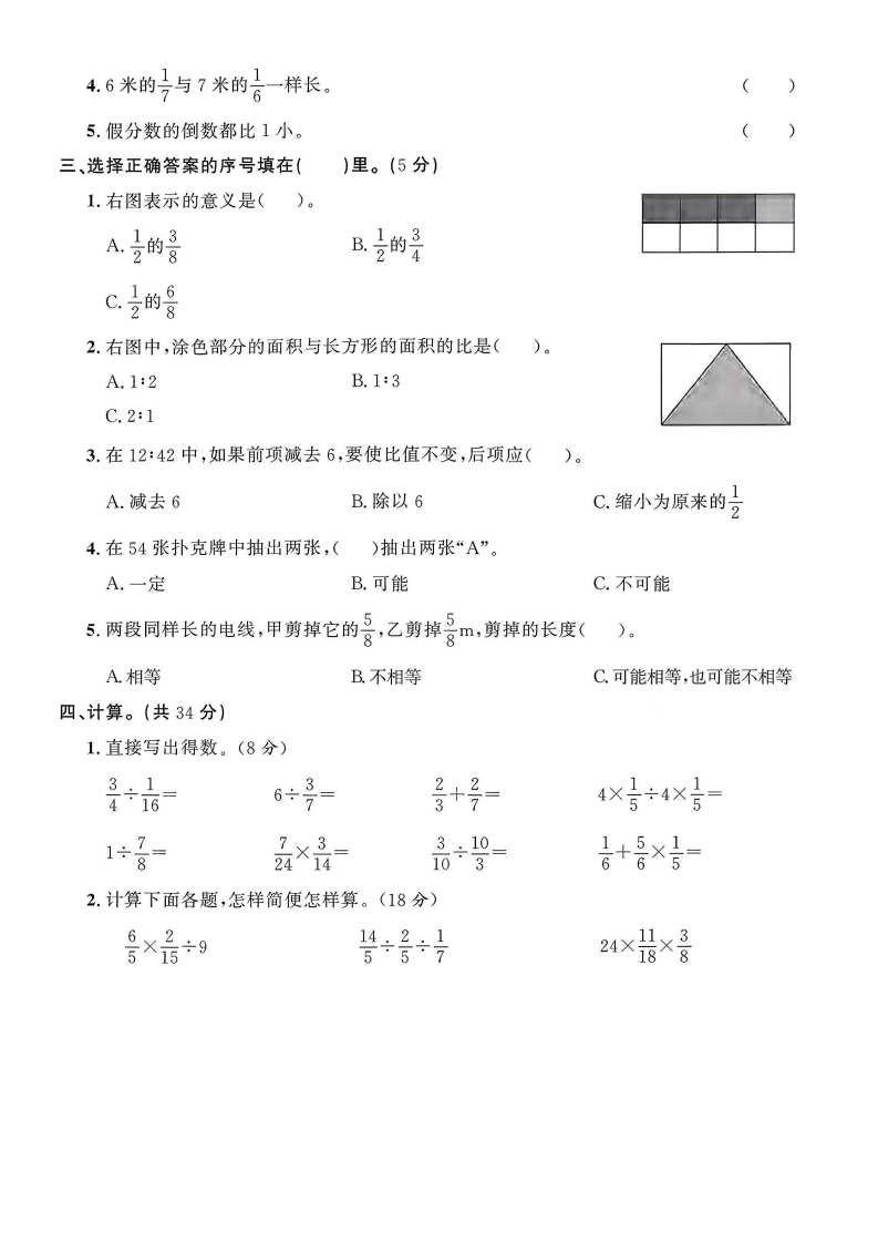 2025青岛63制六年级数学上册期中测试卷期中测试卷(检测时间:90分钟满分:100十10分)露题序三四五六附加题总分得分一、填空。(每空1分,共25分)1.号的倒数是(),()的倒数是它本身。密2.150的号是(),()的号是60.毁封3.6÷(30)=30与=1.2=():()。线4.某班男生占全班人数的号,男、女生人数的比是():()。5.4.2:3.5化成最简整数比是(),比值是()。内6一条绳子长号米,把它平均分成3段,每段是这根绳子的(),每段长()米。童不7.在(○里填上“>”“<”或“=”。要÷7○×号8÷5○8是×○÷日合÷○为8.一个数的号是48,这个数的号是()。答9.一个等腰三角形,顶角和底角的比是3:1,它的顶角是()度,底角是()度10.盒子里有10个红球,8个白球,3个黑球,任意摸一个球,摸到()球的可能性最靠题大,摸到()球的可能性最小。11.甲数除以乙数的商是0.8,甲、乙两数的比是()。12。一根绳子,用去它的受后还剩10米,这根绳子原来长()米二、判断:对的打“√”,错的打“×”。(共5分)》1.一根绳子,用去它的号,还剩号米。☒2×号=1,所以号是倒数e3.比值是号的比,化简后一定是4:7。