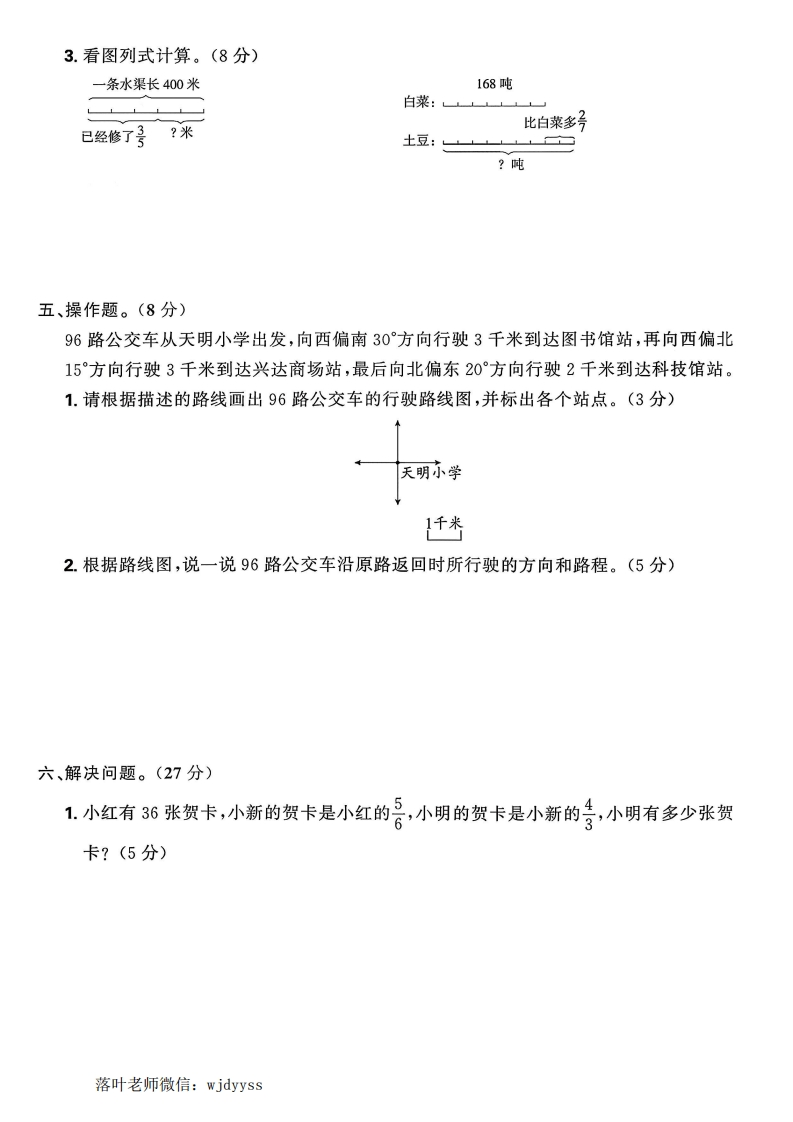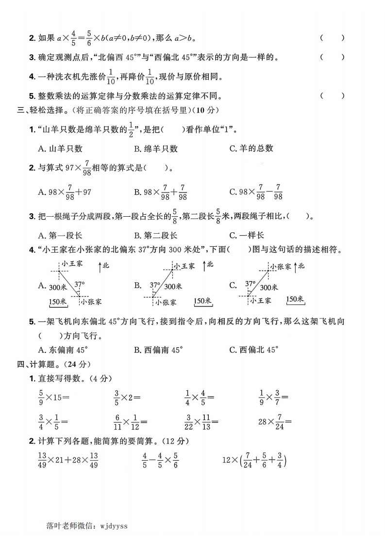 2025-2026学年人教版六年级上册数学月考真题卷第一阶段核心素养测评(月考一)⊙时间:40分钟之满分:100分题号三四五六总分等级得分一、小小填空,奥秘多。(第7题8分,其余每空1分,共26分)1+++()X()=(密2一个正方形的边长是号米,它的周长是()米,它的面积是()平方米。3.右图用乘法算式表示是()×()=(4B时=()分易米=()厘米組务吨=()千克m=()dm3封5.把一根7米长的绳子平均分成8段,每段长()米;其中3段长()米,占全长的()。(填分数〉6,某宠物店去年售出小狗的数量比小箱的数量少行,根据信息,可以列出数量关系式为线()X()=()。7.看一看,填一填。体育馆北25900米,百货大楼西40学校10.5°一东新华书店李小旭家300米南豁体育馆在学校的()偏()()度方向,距离是()米;新华书店在学校的()偏()()度方向,距离是()米;李小旭家在学校的()偏()()度方向,距离是()米;百货大楼在学校的()偏()()度方向,距离是()米。二、我是数学小法官。(对的打“√”,错的打“X”)(5分)()品1+×=1×-是44落叶老师微信:wjdyyss