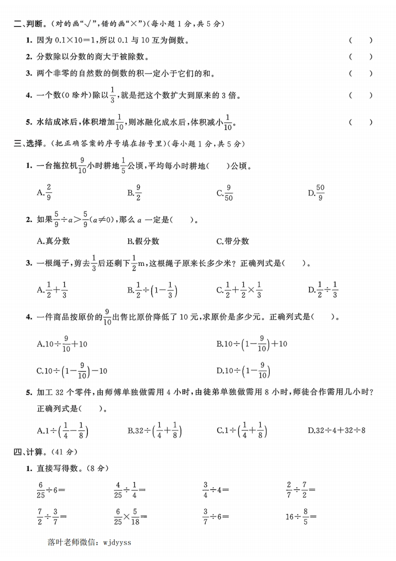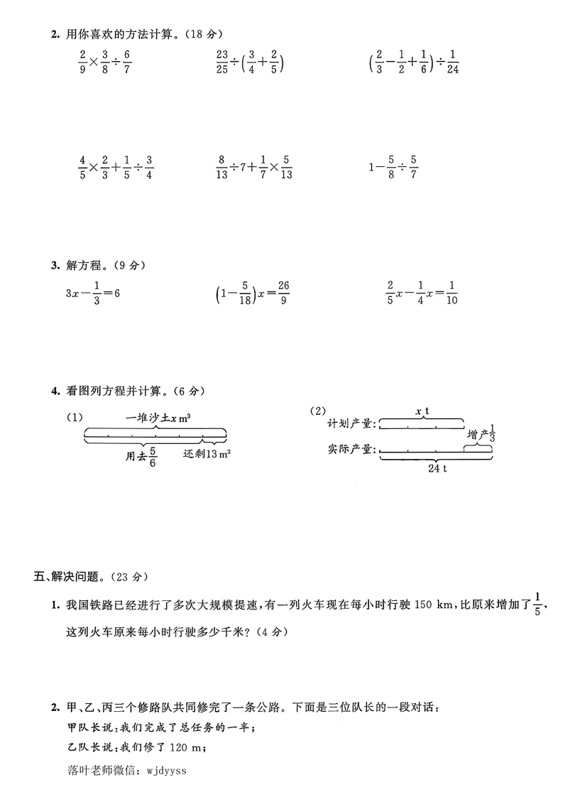 2025人教版六年级上册数学综合提优测试卷第三单元综合提优卷题号四五六总分得分时间:70分钟满分:(100十10)分一、填空。(每空1分,共26分)1.7的倒数是();1的倒数是(12);气的倒数是(),()没有倒数。密2.把一根木料平均截成6段,每段是这根木料的把一根长子m的木料平均裁成3段,每段长()m13.20m是()m的号12kg比()kg少4)分钟比1小时多34.一辆货车行驶6km耗油亏L,平均每升汽油可行驶()km;行驶1km耗油()L。5.“女生人数是全班人数的号”,这句话中把()看作单位“1”,其用数量关系式表示是)x号=()。屬线6一本160页的书,充亮每分钟可以看号页,已经肴了全书的名,他已经看了()页,他已经看了()分钟。7.在○里填上“>”“<”或“=”。12÷3○)1278是1133÷爵×号7÷258.甲数的与乙数的g相等,如果乙数是60,那么甲数是()。9.修一条公路,甲队单独修要6天完成,乙队单独修要9天完成。甲、乙两队合修,()天还剩下这条公路的行,110.有4t货物,甲车每次运走货物的,乙车每次运走4t。如果两车单独运走这些货物,那么甲车需要运()次,乙车需要运()次。落叶老师微信:wjdyyss