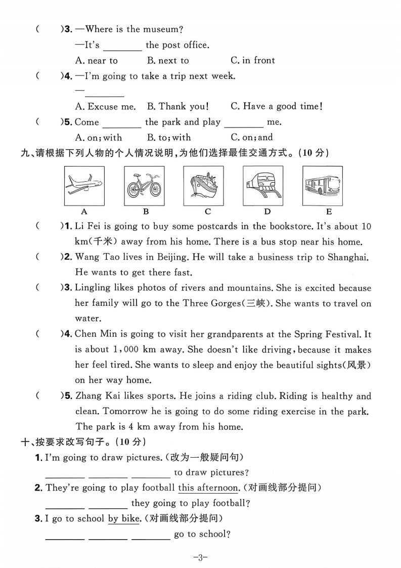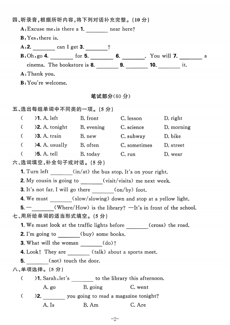 2025-2026学年人教版六年级上册英语期中测评卷期中综合素养测评卷时间:40分钟满分:100分题号二三四五六七八九十二总分等级得分听力部分(40分)一、听录音,给下列图片排序。(10分)】听力扫码密二、听录音,选择正确的答语。(10分)封()1.A.Yes,he does.B.Yes,it is.C.No,he isn't.()2.A.She works at the sea.B.He's from the New Zealand.C.He works on a boat.)3.A.I feel sad.B.It's over there.C.I often come on foot.线)4.A.It's Saturday.B.Next Saturday.C.Last Saturday.)5.A.She's a writer.B.He's a worker.C.I'm a singer.三、听录音,选择正确的答案。(10分)】()1.Where is Amy going?A.She is going to the post office.B.She is going to the science museum.)2.How can Jack get to the Chinese restaurant?A.Turn left at the cinema.B.Turn right at the cinema.郭)3.How does Mike often go to the park?A.By bike.B.On foot.)4.What is Lily going to do after school?A.She is going to see a film.B.She is going to visit her grandparents.)5.What is Tom going to buy this evening?A.He is going to buy a storybook.B.He is going to buy a dictionary.-1