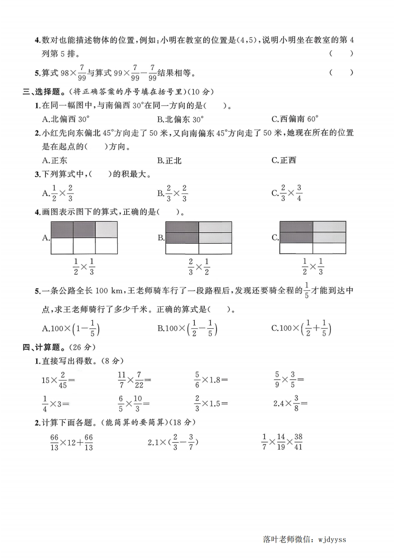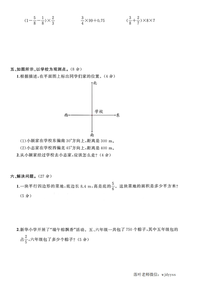 2025人教版六年级数学上册第一次月考卷.(检测范围:第一、二单元)时间:90分钟满分:100分+10分题序二三四五六附加题总分n得分一、填空题。(24分)125的是(),2小时是()分,8米的号是()米弥2一根绳子长m,用去了年m,还剩()m;如果用去4,还剩()mo封3.从学校向西走100m就到了超市,那么从超市向()走()m就到了学校。都4.小虎在计算5+24)时,把算式看成了×☐+24,他得到的结果比正确的结线果多了(5在(○里填上“>”“<”或“=”。内8×4○89×不6.某冷饮店6月份计划营业额为7.2万元,实际超额,实际营业额为)万元。7如图,周末小军从家到小涛家小涛家北玩,他先沿()偏(要小军家)方向走()米到书709200米店,接着沿()方向走答()米到超市,最后沿书店超市)偏()()方向走()米到小涛家。叔8.在学校举行的“环保小卫士”活动中,学生们一共收集废旧电池470节,其中六年级学题生收集的数量占总数量的,五年级学生收集的数量占六年级的、五年级学生收架了()节。二、判断题。(对的画“√”,错的画“X”)(5分)1.3×和×8表示的意文和计算结果都相同。()☒警2,3千克铁的行和1千克棉花的一样重。3.5米长的绳子,用去号,还剩号米。(落叶老师微信:wjdyyss