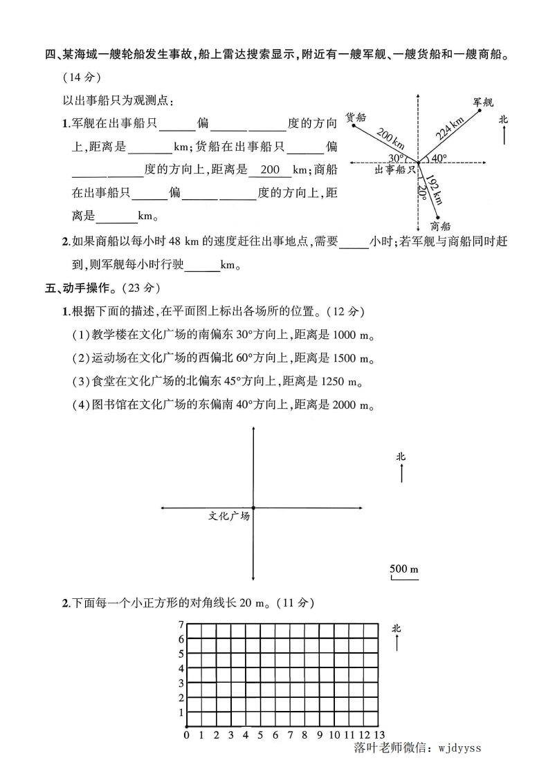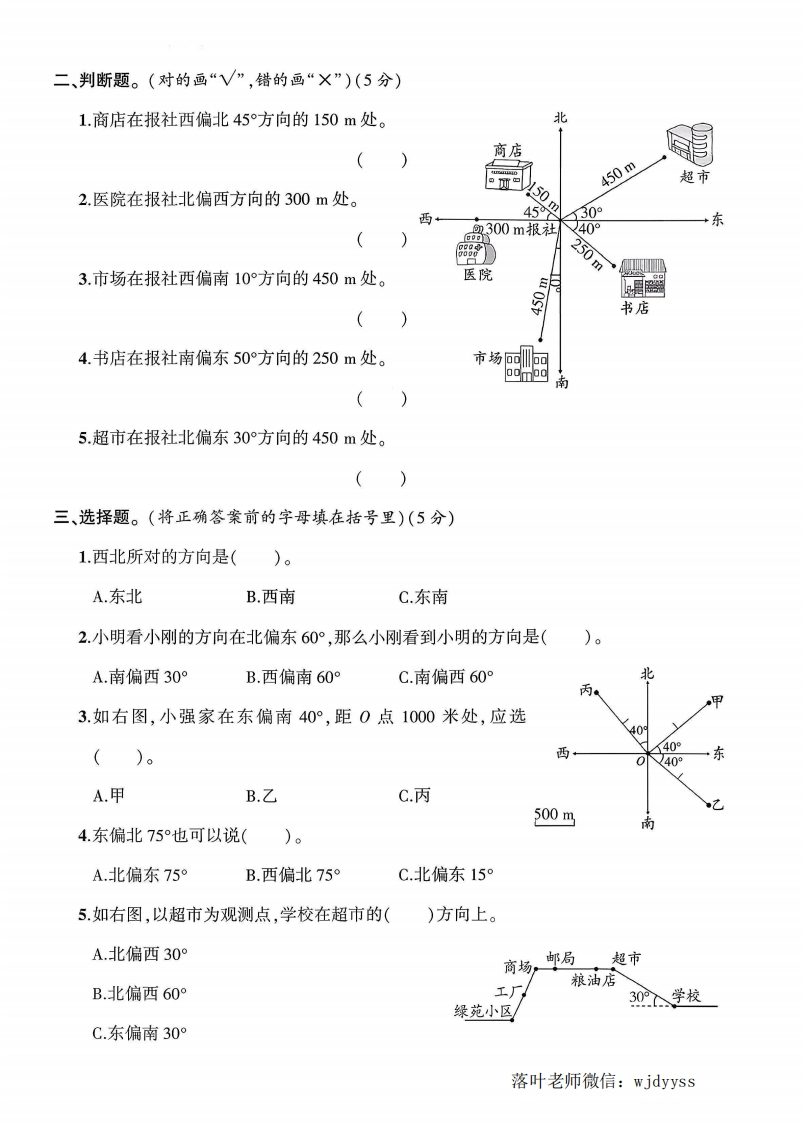 2025人教版六年级数学上册单元测试卷第二单元测试卷霈检测时间:90分钟满分:100分+10分题序二三四五六附加题总分得分一、填空题。(每空1分,共33分)弥1.在一幅平面图上,用1cm代表50m,那么300m应画()cm,图上画5cm表示实际()mo如封2.小红家在学校东偏()()°方向上;百乐商场在学校()偏()(方向上;在学校南偏西40°方向上的是()。线百乐商场北30小红家北邮局内小丽⑧30°学校东J30北西400东402030广场不医院·龙华宾馆30超市100m南小军南(第2题图)】(第3题图)》(第4题图)要3.小丽在小军的()偏()30°方向上;小军在小丽的()偏()30°方向上。答4.邮局在广场()偏()40°方向上()m处;超市在广场的()偏(30°方向上()m处。靠题5周末,小敏想去图书馆看书。下面是小敏从家到图书馆的路线图,请你看图填一填。小敏从家出发,向()偏()(银行北的方向走()m到(),再向文30°图书馆()方向走()m到(),然邮局后向(公园)方向走()m到☒(),最后向()偏()(200m小敏家的方向走()m到图书馆。侣落叶老师微信:wjdyyss