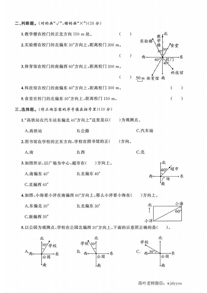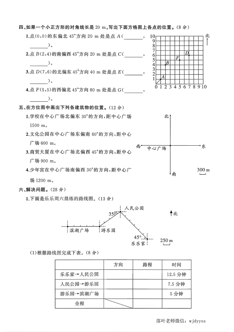 2025人教版六年级数学上册单元测试卷第二单元测试卷时间:90分钟满分:100分+10分题序三四五六附加题总分得分一、填空题。(32分)1.以学校为观测点,小慧家在学校的南偏西20°方向上,距离学校500m:以小慧家为观测弥点,学校在小慧家()偏()()方向上。封2.以公园为观测点。小菲家。北电影院线40西3036高30°公内少年宫图书馆4km南(1)电影院在公园()偏()()方向上,距离是()km。不(2)小菲家在公园()偏()()°方向上,距离是()km.(3)少年宫在公园()偏()()°方向上,距离是()km要(4)图书馆在公园()偏()()°方向上,距离是()kme答3.下图是某市旅游专线公交车行驶的线路图,请根据线路图说一说:毁1抗战纪念馆文化公园·博物馆北题1.5 km652.6km50%2 km1.4km1.5km起点青铜小镇广场(1)旅游一号车从起点站出发,向()行()km到达青铜小镇,再向北偏(()°方向行()km到达抗战纪念馆,再向()行()km到达文化公园。:(2)从博物馆向南偏()()°方向行()km到达广场,再向北偏(()方向行()km到达文化公园。落叶老师微信:wjdyyss