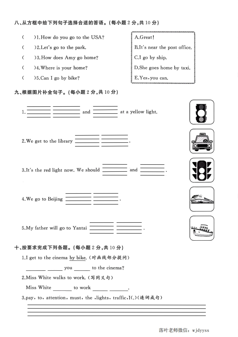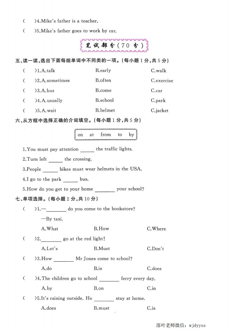 2025人教版六年级英语上册单元测试卷第二单元测试卷时间:60分钟满分:100分题序二三四五六七八九十一十二总分得分:1听力部分(30分听方韩字(30弥一、听句子,选出句子中所包含的选项,听2遍。(每小题1分,共5分)】扫码听听力1()1.A.sometimesB.usuallyC.always封)2.A.by planeB.by ferryC.by train靠()3.A.a hatB.a helmetC.a cap线()4.A.the red lightB.the green lightC.the traffic lights)5.A.go to schoolB.stop and waitC.come on foot二、听句子,用1~5的序号给下列图片排序,听2遍。(每空1分,共5分)内不三、听五段小对话,在表格内相应的位置画“√”,听2遍。(10分)要NameWay0 o答Mr BlackMrs Black题MikeTomLily四、听短文,判断下列句子是(T)否(F)正确,听2遍。(每小题2分,共10分))1.Mike is a student.()2.Mike usually goes to school by subway)3.Mike's mother goes to work by subway,too.落叶老师微信:wjdyyss