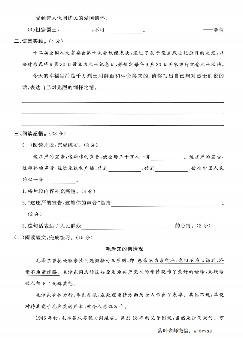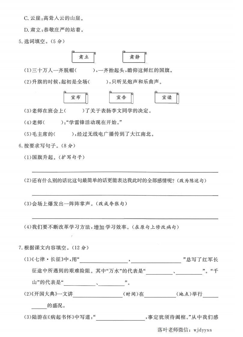 2025人教版六年级语文上册单元测试卷第二单元测试卷罪检测时间:90分钟满分:100分题序二三四总分得分一、积累运用。(43分)弥1.读拼音,写字词。(6分)毁封(1)国庆节那天,天安门广场挂着鲜艳的qízhi民解放军穿着英气勃发线的zhif0迈着整齐的方步,hui到广场,接受jian yue内童不要(2)班长的话音刚落,教室里一片fei tengbàofa出一阵雷答鸣般的掌声。2.下列词语中,构词方式与其他三项不同的是()。(2分)第题A.斩钉截铁B.粉身碎骨C.排山倒海D.纹丝不动3.把下列词语中的错别字圈出来,并改正。(8分)横七坚八()悬崖峭璧()满腔恕火()斩钉接铁()排山到海()昂手挺胸()壮烈毫迈()千均一发()☒4.下列词语解释不正确的一项是()。(2分)A.等闲:悠闲,闲适。任B.气壮山河:形容气概像高山大河那样雄伟豪迈。落叶老师微信:wjdyyss