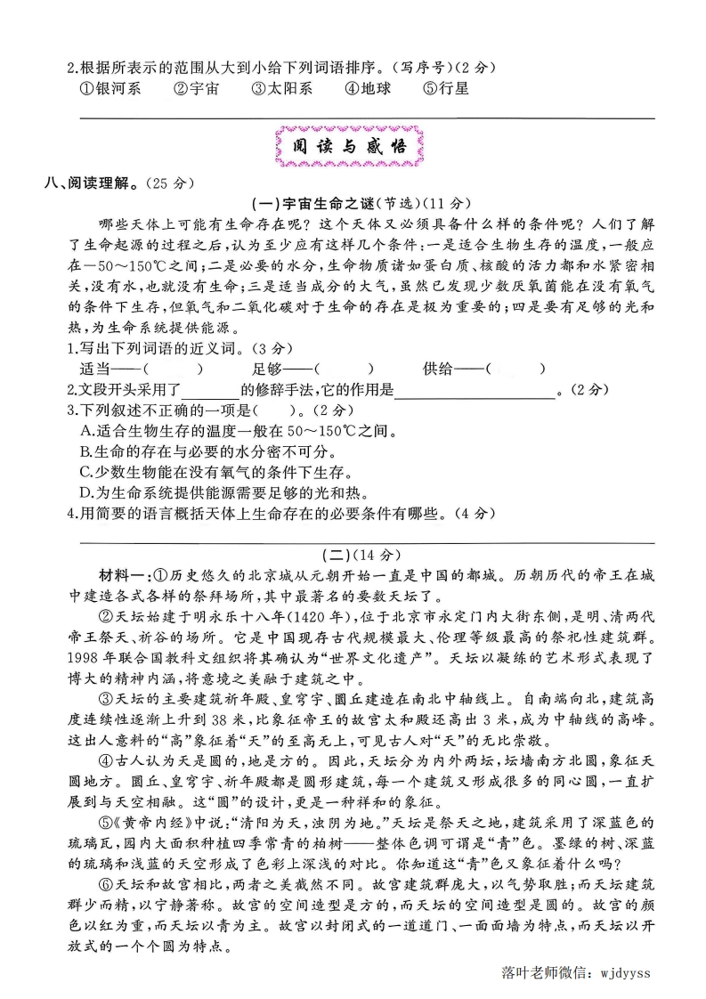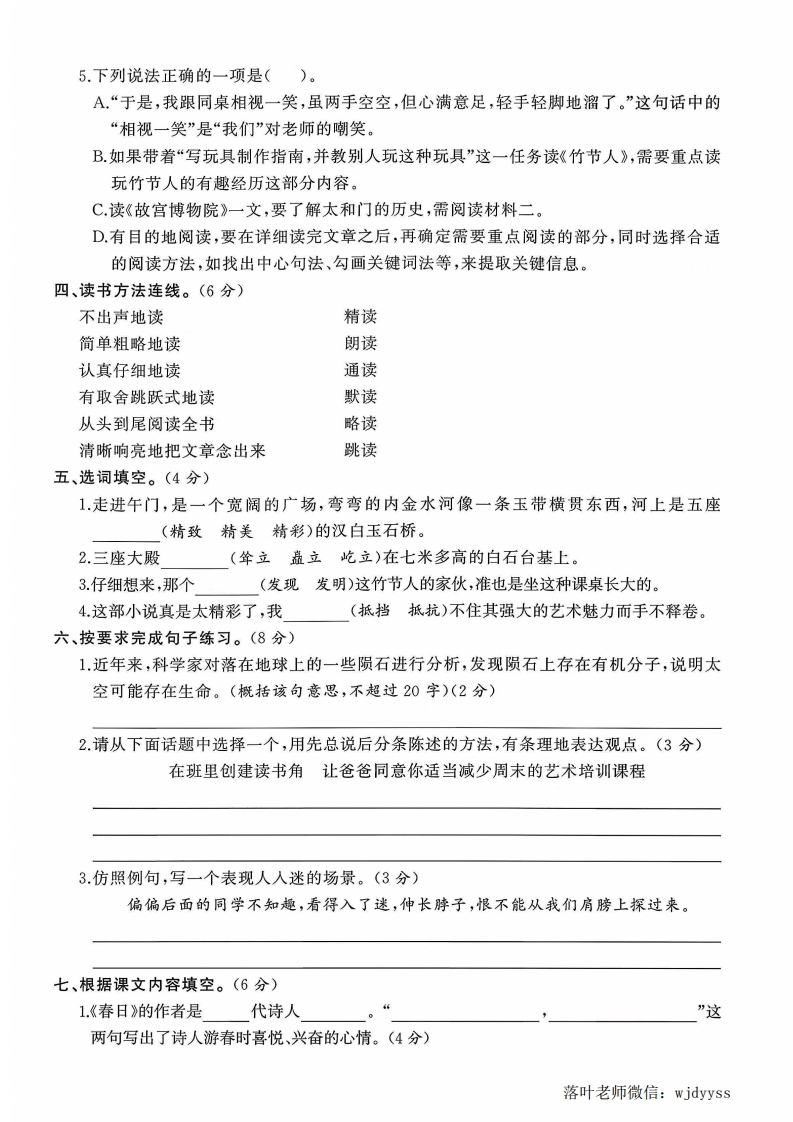 2025人教版六年级语文上册单元测试卷第三单元测试卷时间:90分钟满分:100分题序三四五六七九总分得分:基础巩固地为为%类类类日弥一、在加点字的正确读音下面画“”。(3分)吓人(xiàhè)毛笔杆(gdngan)陨石(yinyun)金銮殿(luan nuan)额枋(fangfang)正月(zhengzheng)封二、读拼音,写词语。(8分)靠pei yangduòjiaojǔsangtuiran线choutiban dianhaidàojiekai内三、选择题。(10分)量不1.下面词语书写全部正确的一组是()。A.苍海一粟得意扬扬津津有味B.井然有序天寒地冻全神惯注要C.别出心裁技高一筹虎视眈眈D.唯妙唯肖迥然不同鸣钟击磬2.下面句子中加点词使用不恰当的一项是()o答A.他的书写十分工整,写的字井然有序。毁B.雪片跟冷风把人们关进屋里,连门板都上得严丝合缝。C这场乒乓球比赛,我校选手技高,筹,取得了胜利。题D跟宇宙相比,地球又是如此渺小,有如沧海一粟。3.下列各句中的“新”与“无边光景一时新”的“新”意思最接近的是()。A.空山新雨后,天气晚来秋。B.移舟泊烟渚,日暮客愁新。:C.向晚双池好,初晴万物新。D渭城朝雨浥轻尘,客舍青青柳色新。4.下列句子没有语病的一项是()。A.人们至今尚未没有在地球以外的太空中找到生命存在的确凿证据。B.只要有一个人做了一件新鲜玩意,大家看了有趣,很快就能风靡全班。C,前三殿的图案以龙为主,后三宫凤凰逐渐增长。D.我国古代建筑艺术集中体现了故宫建筑群的独特风格。落叶老师微信:wjdyyss