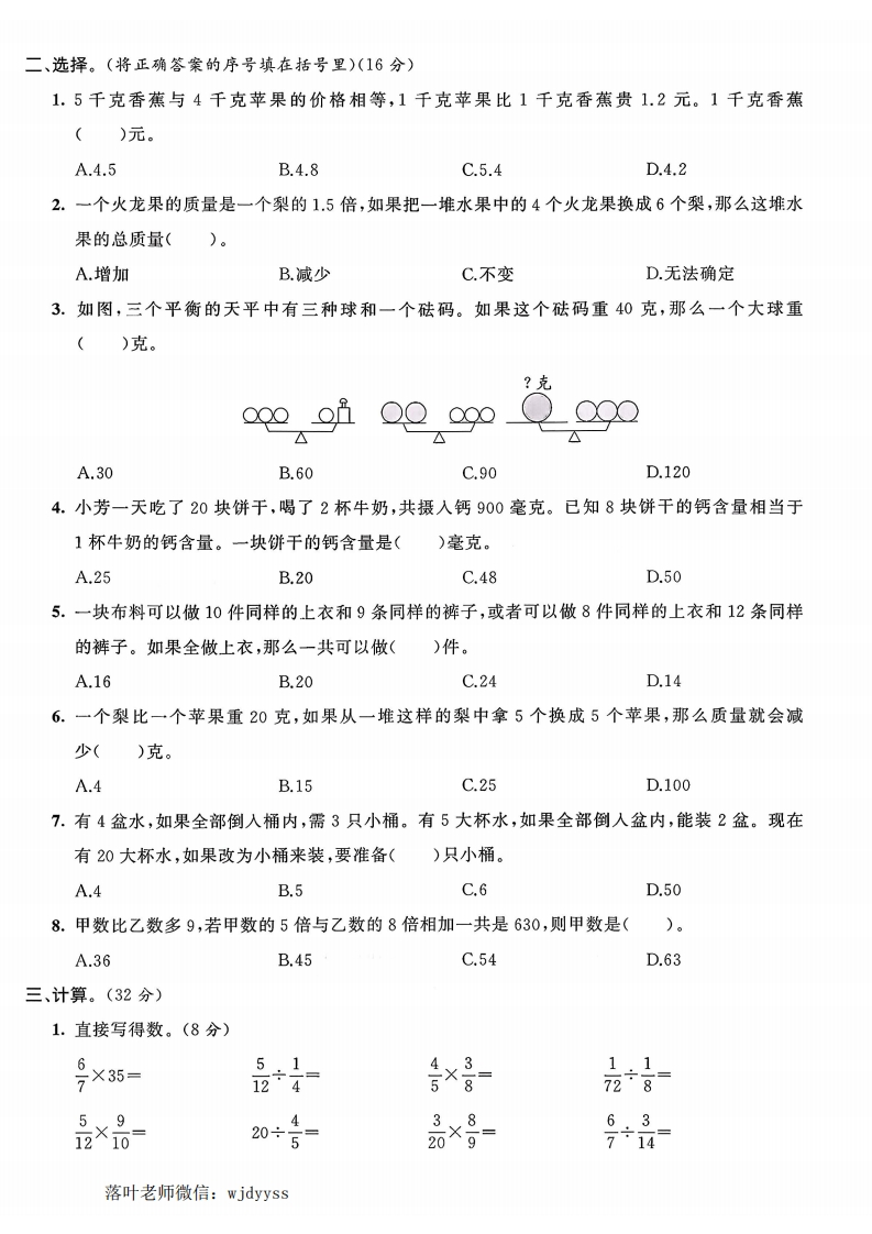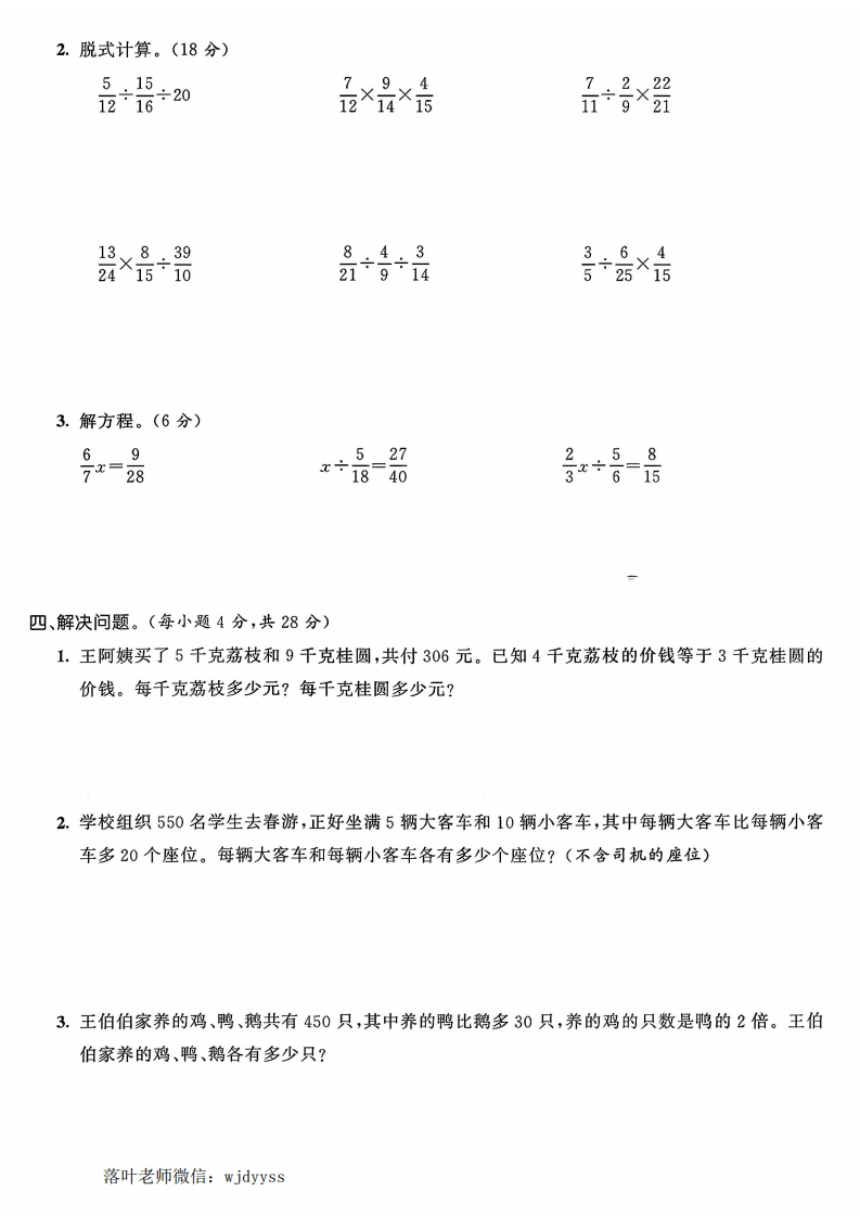 2025苏教版六年级上册数学综合提优测试卷第四单元综合提优卷题号三四五总分得分时间:90分钟满分:(100十10)分一、填空。(每空1分,共24分)1.圆珠笔的单价是钢笔的,买3支钢笔的钱可以买()支圆珠笔,买20支圆珠笔的钱可以买()支钢笔,2支钢笔和16支圆珠笔的价钱相当于()支钢笔或()支圆珠笔的价钱。密2.2只兔子与3只鸡的质量相等,那么10只兔子的质量与()只鸡的质量相等,18只鸡的质量与()只兔子的质量相等。20kg一只猴子重()千克,一只小狗重)千克。4.校足球队买了20套训练服和12套比赛服,共付4680元。每套训练服比每套比赛服便宜70元,每套训练服()元,每套比赛服()元。5.六年级二班元旦晚会布置教室用去黄花和红花共54朵,如果将4朵红花换成黄花,则黄花和红花同样多。红花共有()朵6.甲比乙多10,甲的6倍比乙的4倍多210,甲是(),乙是()。7.甲、乙两仓库共存粮108吨,如果甲仓库运出粮食的一半,乙仓库运进18吨,那么两个仓库存粮吨数正好相等。原来甲仓库存粮()吨.乙仓库存粮()吨。8.甲、乙两人拿同样多的钱合买练习本,买了以后,由于甲比乙多拿了10本,因此甲需给乙6元钱,每本练习本()元9.100位师生绿化校园,老师每人栽3棵树,学生每2人栽1棵树,一共栽了100棵树,老师有()人,学生有()人10.小华在超市购买了3袋薯片和2盒果冻。一共花了19.5元,已知每袋薯片比每盒果冻贵1.5元,每袋薯片()元;如果购买2袋薯片和3盒果冻,一共需要()元11.3千克菠菜和2千克荷兰豆的总价为12.4元,2千克菠菜和1千克荷兰豆的总价为7.1元。每千克菠菜()元,每千克荷兰豆()元。12.如果12只羊能换4匹马,10匹马能换2头牛,16只兔子能换2只羊,那么1头牛能换(只羊,3匹马能换()只兔子。落叶老师微信:wjdyyss