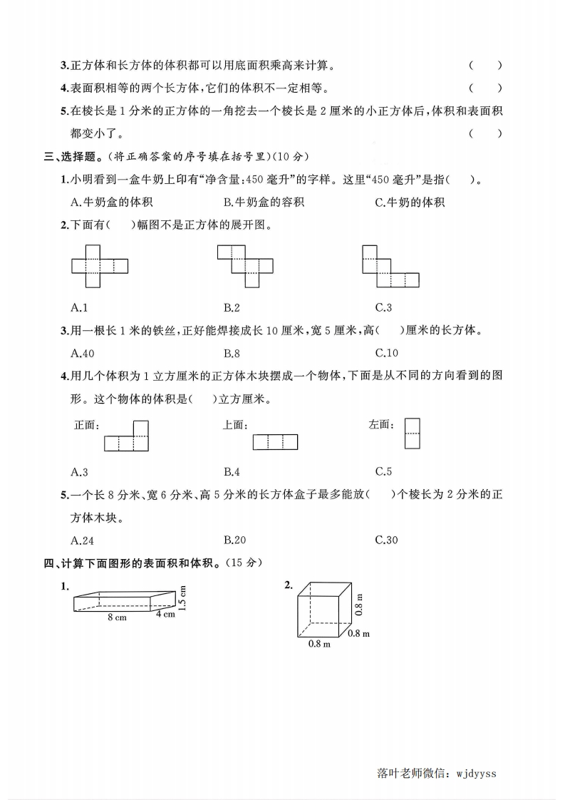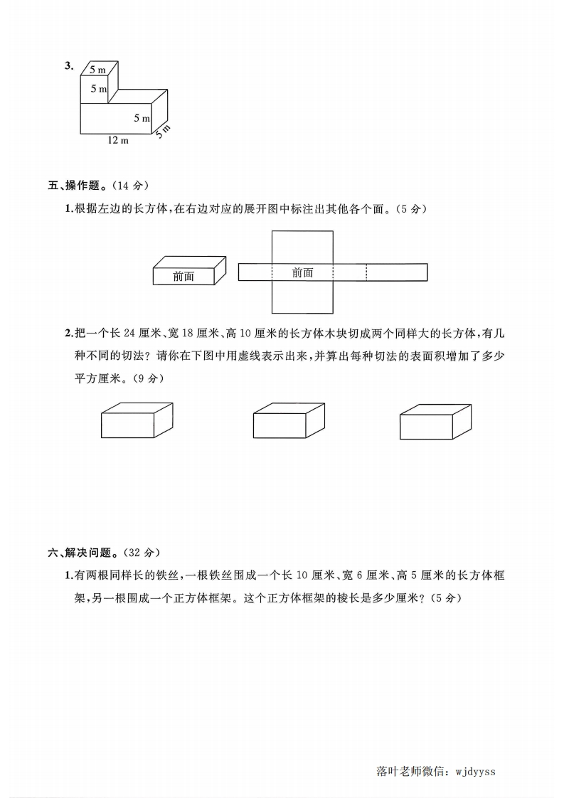 2025苏教版六年级数学上册单元测试卷第一单元测试卷时间:90分钟满分:100分+10分题序三四五六附加题总分得分、填空题。(每空1分,共24分)1.求做一个长方体鱼缸要用多少玻璃,是求鱼缸的();求这个鱼缸占多大空间,弥是求鱼缸的();求这个鱼缸能装多少水,是求鱼缸的()。2.在括号里填合适的单位。封国旗的旗杆高15(一间教室所占的空间大约是150(荞汽车油箱的容积是40(一本数学书的体积约是280(线3.7.8升=()毫升820立方厘米=()立方分米..4.03立方米=()立方分米56立方厘米=()毫升4.一块长25厘米,宽12厘米,厚8厘米的传,所占的空间是()立方厘米,占地面积最大是()平方厘米。量5.挖一个长和宽都是5米的长方体菜窖。要使菜窖的容积是50立方米,应该挖()米深。6.一个棱长是4分米的正方体水箱内,水面的高度为2分米,水的体积是()升。7.将一个棱长是6厘米的正方体钢材熔铸成一个底面积是18平方厘米的长方体。这个长方体的高是()厘米。(损耗忽略不计)18.右图是由1立方厘米的小正方体摆成的物体,它的体积是()立方厘米,表面积是()平方厘米。拟9.用三个棱长都是8厘米的正方体拼成一个长方体,表面积是()平方厘米,体积是题()立方厘米。10.一个表面涂色的正方体,每条棱都被平均分成6份,再切成同样大的小正方体,能切成()个同样大的小正方体。其中3面涂色的小正方体有()个;2面涂色的小++正方体有()个;1面涂色的小正方体有()个。二、判断题。(对的画“/”,错的画“X”)(5分)1.长方体是特殊的正方体。2.一个长方体最多有4个面完全相同。(落叶老师微信:wjdyyss