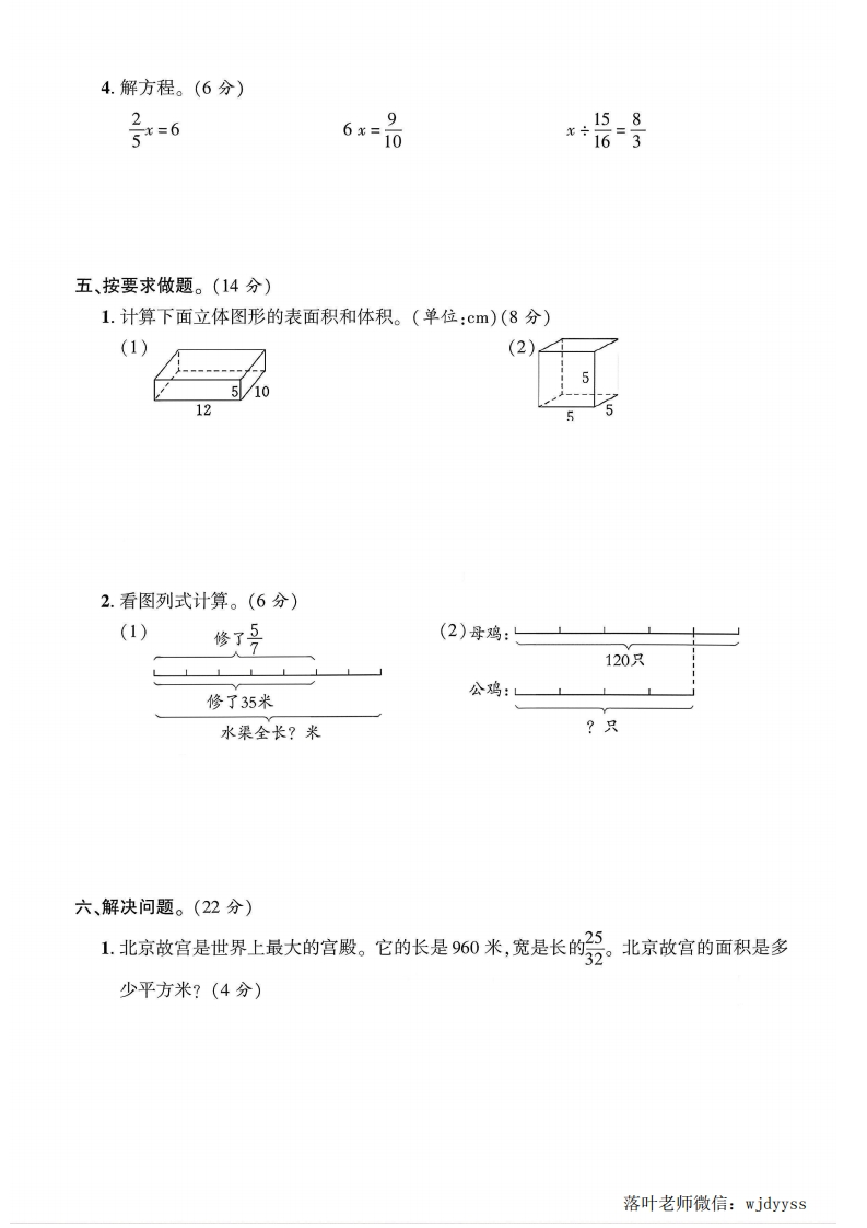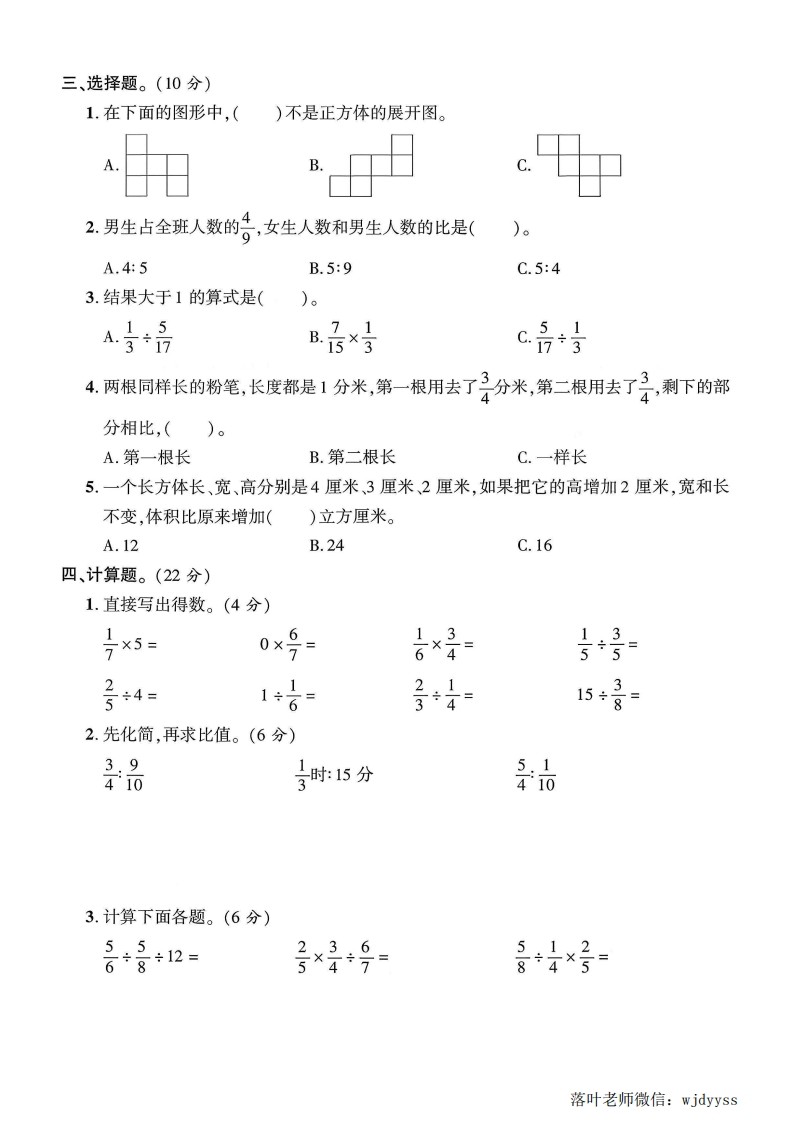 2025苏教版六年级数学上册期中测试卷期中测试卷器检测时间:90分钟满分:100分+10分题序二三四五六附加题总分分数一、填空题。(27分)弥1子时=()分品立方分米=()立方厘米毁封750千克-(月吨270立方厘米=()毫升=()升2.12:18=(。)=6÷()=16:(线3.()的倒数是1;()与号互为倒数。内42千克的2是()千克,2千克是()千克的35在(○里填上“>”“<”或“=”。蠻不3-21×7要6.商场进行促销活动,某种衣服按原价的号进行销售,现售价72元,则这件衣服原价是()元。7.把号0.3化成最简整数比是(),比值是()o答8.一个三角形内角度数的比是1:2:3,这个三角形是()三角形,两个锐角的度数分别是()°和()°。家题9.一个正方体的棱长总和是84厘米,这个正方体的棱长是()厘米,表面积是)平方厘米,体积是()立方厘米。10.两个棱长都是5厘米的正方体木块拼成一个长方体后,表面减少了()平方厘米,长方体的体积是(250)立方厘米。二、判断题。(对的画“V√”,错的画“X”)(5分)17=71=7。(因2.因为4×子=1,所以4和4都是倒数。(哑3.一个奶瓶的容积约是120毫升。)径4.大正方体和小正方体的棱长的比是5:3,体积的比也是5:3。5.在8:7中,如果比的前项加8,要使比值不变,比的后项也应加8。落叶老师微信:wjdyyss