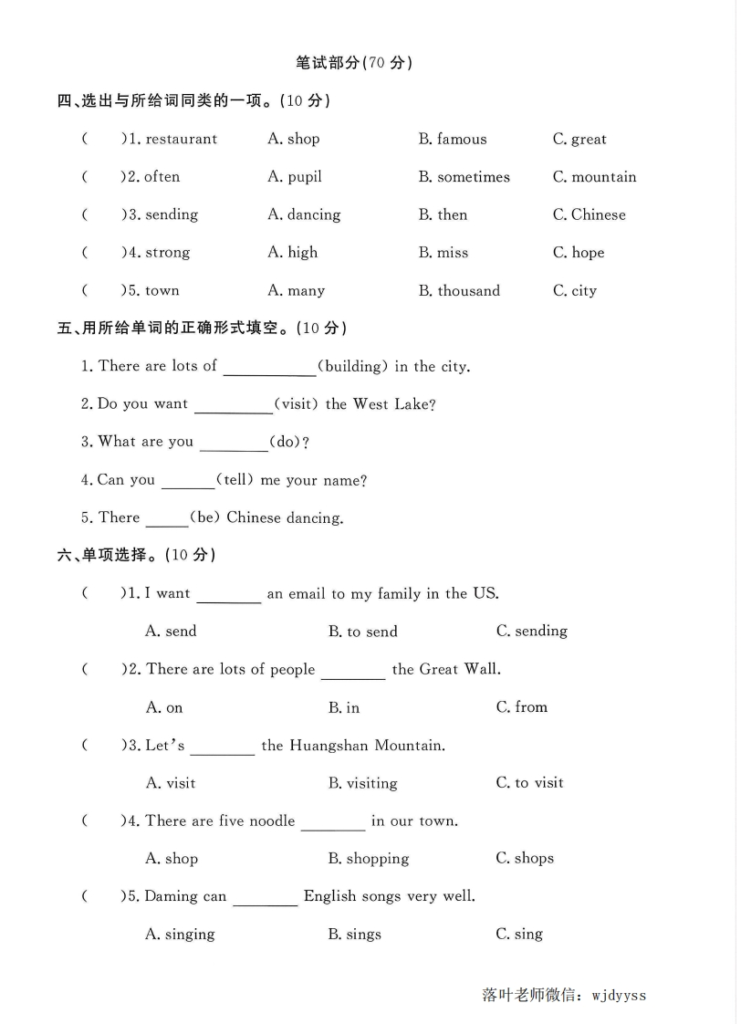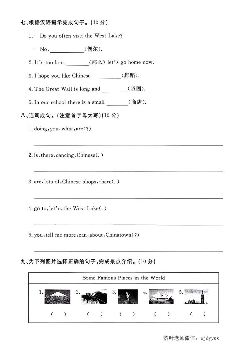 2025外研版六年级英语上册单元测试卷第二单元测试卷检测时间:60分钟满分:100分题序三四五六七八九总分得分听力部分(30分)密一、听录音,选出你所听到的单词。(10分)》扫码T听万)1.A.peopleB.shopsC.restaurants毁封)2.A.ChinaB.ChinatownC.Chinese线)3.A.writingB.sendingC.readingB.rivers内)4.A.lakesC.parks)5.A.famousB.beautifulC.long黨不二、听录音,选出与所听内容相符的图片。(10分)要A.B.DMIe出eE.答2.35.靠题三、听录音,判断下列句子正(T)误(F)。(10分))1.There are lots of mountains in China.)2.The Huangshan Mountain is high and beautiful.)3.There are many Chinese restaurants in Chinatown.☒)4.They will go to the Great Wall tomorrow.)5.There's Chinese dancing in the street now.落叶老师微信:wjdyyss