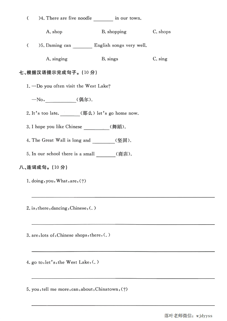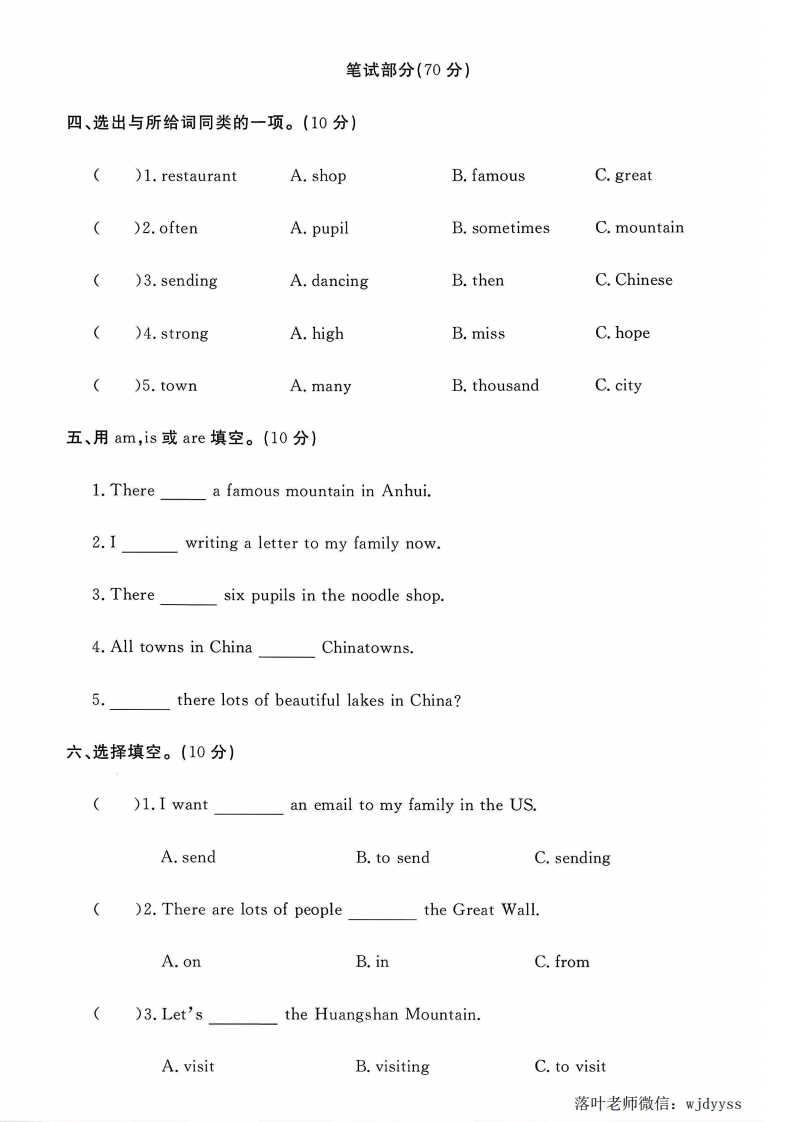 2025外研版六年级英语上册单元测试卷第二单元测试卷(检测时间:60分钟满分:100分)拍码[力郭题序三四五六七九十总分得分听力部分(30分)密一、听录音,选出你所听到的单词。(10分)】)1.A.dancingB.doingC.sending毁封)2.A.somethingB.sometimesC.thousand线)3.A.shoesB.shopsC.Chinese)4.A.want内B.longC.strong)5.A.thanB.thenC.there童不二、听录音,选择与所听内容相符的图片。(10分)】要A.B.DE答2.3.5靠题三、听录音,判断句子正(√/)误(×)(10分))1.There are lots of mountains in China.)2.The Huangshan Mountain is high and beautiful.()3.There are many Chinese restaurants in Chinatown.公吧()4.They will go to the Great Wall tomorrow.e)5.There's Chinese dancing in the street now.落叶老师微信:wjdyyss
