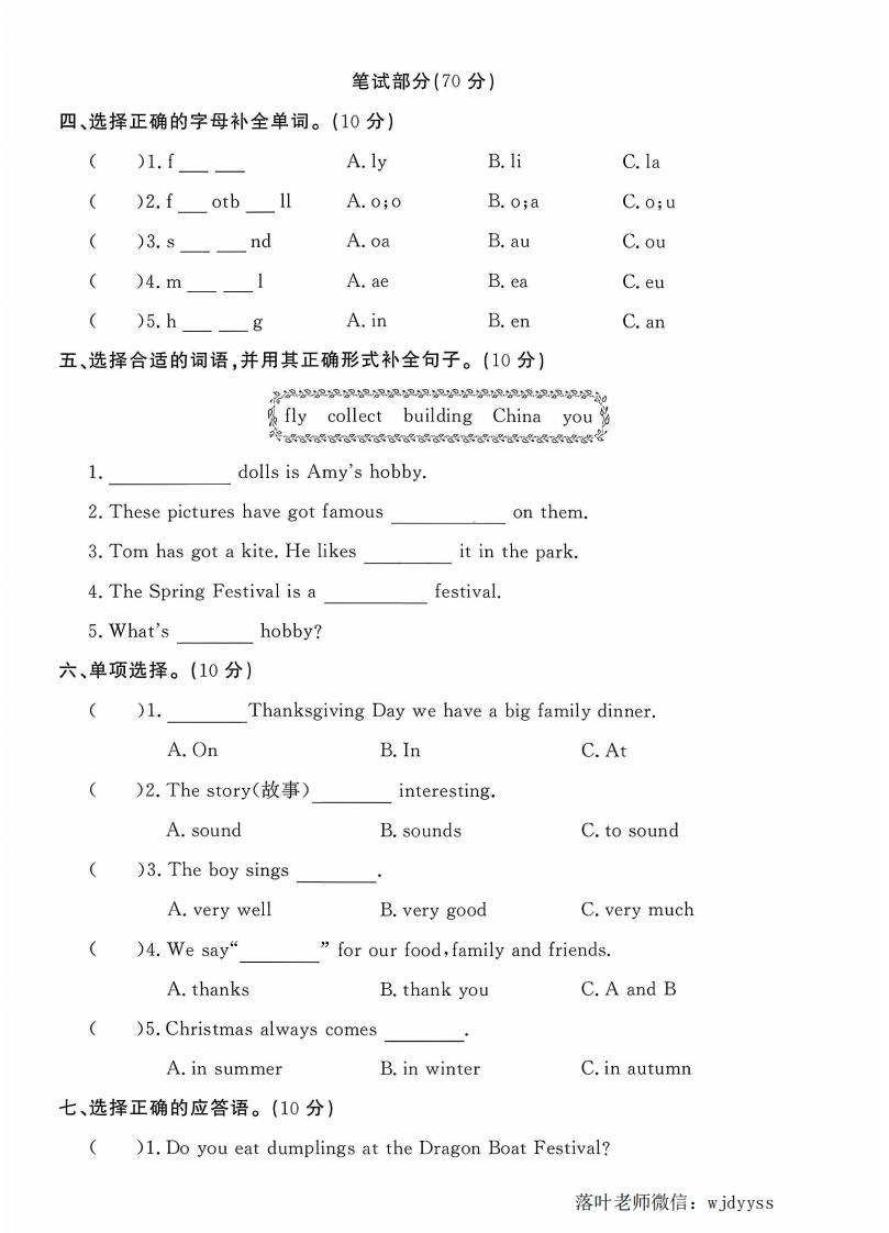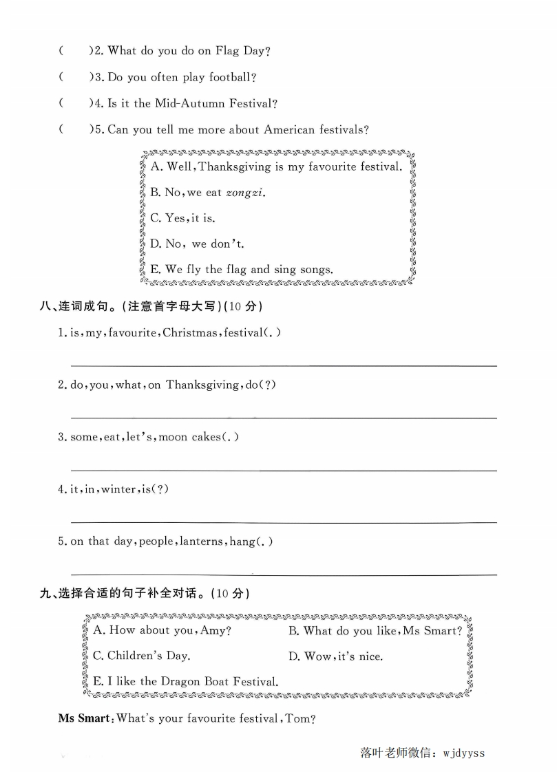 2025外研版六年级英语上册单元测试卷第四单元测试卷霸时间:60分钟满分:100分题序三四五六七八九+总分得分听力部分(30分)】密一、听录音,选出你所听到的短语。(10分】()1.A.Children's DayB.Flag DayC.Thanksgiving Day毁封()2.A.fly a kiteB.fly the flagC.collect flags线()3.A.favourite festivalB.favourite foodC.American festivals内()4.A.have a family dinnerB.have a big partyC.have a special meal童)5.A.a basketball gameB.a football gameC.a ball game不二、听录音,给下列图片排序。(10分)】要答荞题三、听录音,判断下列句子正(T)误(F)。(10分)()1.The Dragon Boat Festival is in winter.()2.My favourite festival is the Dragon Boat Festival.)3.We all go to see the dragon boat race.☒()4.My mother makes delicious moon cakes at the Mid-Autumn Festival.()5.My father sings songs about the stars.落叶老师微信:wjdyyss