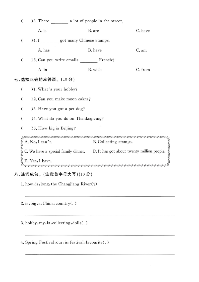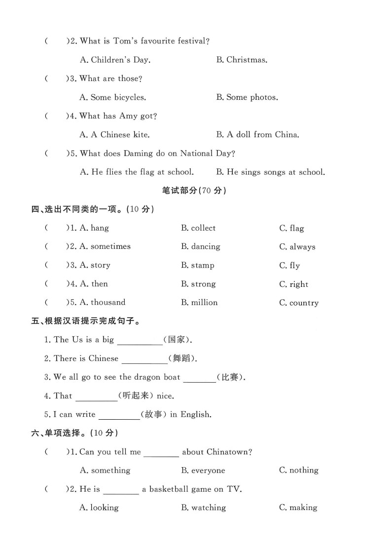 2025外研版六年级英语上册期中测试卷期中测试卷检测时间:60分钟满分:100分题序三四五六七八九+总分得分听力部分(30分)密一、听录音,选出你所听到的单词或短语。(10分)()1.A.ballB.dogC.doll吗TT刀毁封()2.A.ChinaB.ChineseC.chair()3.A.foodB.flyC.flag线()4.A.mealB.meatC.miss内()5.A.sing songsB.watch TVC.sing and dance二、听录音,选出你所听到的句子。(10分)童不)1.A.Look at the picture of the Great Wall.B.Look at the picture of the West Lake.要)2.A.Thanksgiving is my favourite festival.答B.Christmas is my favourite festival.)3.A.Here is a flag of China.题B.Here is a flag of America.)4.A.It's in the east.B.It's in the west.)5.A.These letters are important.B.These postcards are great.三、听录音,选出正确的答案。(10分)☒)1.What's Peter's hobby?栏A.Playing computer games.B.Taking pictures.