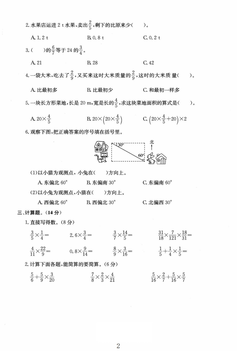2025六年级上册数学第一次月考测试卷第一次月考测试卷时间:90分钟满分:100+10分题号三四五总分附加题等级得分一、我会填。(17分)1.求3个号相加是多少,列加法算式是(),乘法算式是()。2.一个西瓜重5.2kg,小丰吃了它的4,小丰吃了()kg。3.李师傅每小时加工一批零件的8,2小时加工这批零件的()。4.希望小学有学生675人,五年级的人数占全校人数的号,五年级有()人5。一种空调原价4800元,“十一”期间商家促销搞活动,降价品销售,这种空调现价()元。6.(层+号)×45-号×45+号×45运用了()律,结果是()。7.一块布长号m,用去号m,还剩()m;一块布长号m,用去号后,还剩()m。8.一本故事书共180页,洋洋第一天看了全书的子,第二天应从第()页看起。9.在○里填上“>”“<”或“=”。号×1.4○92.4×○月号×8○品品×○分×29×8○96×号○4×品二、精挑细选。(14分)1.下面()的积在号和之间。A号×2B×c×号1