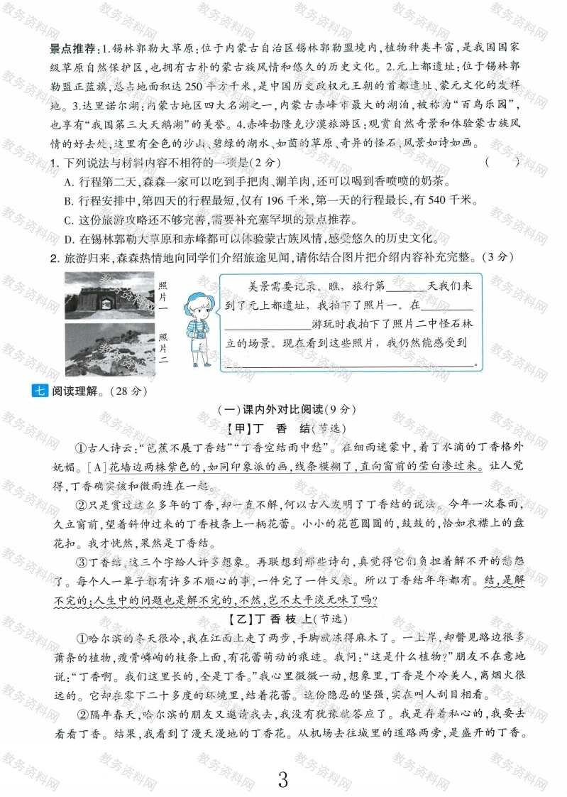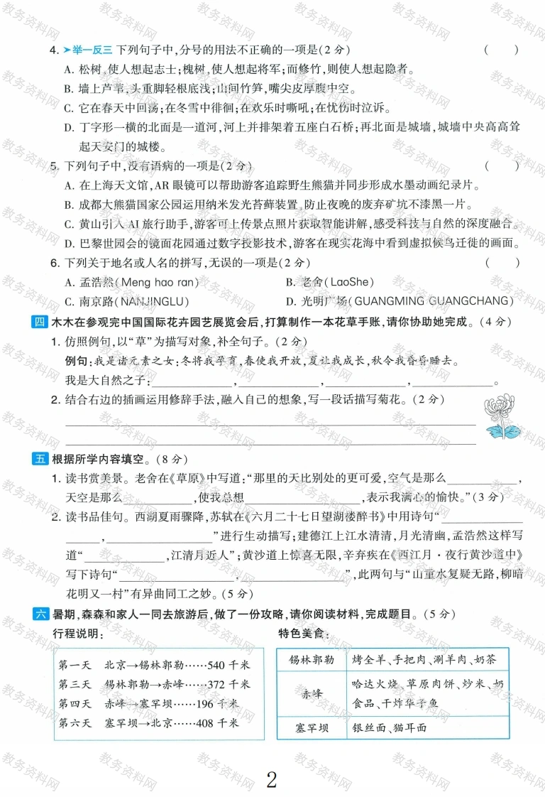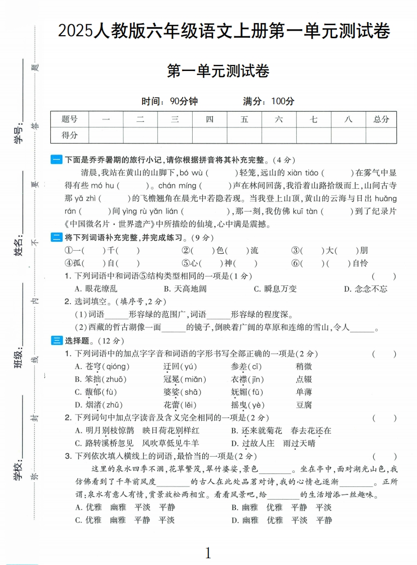 2025人教版六年级语文上册第一单元测试卷第一单元测试卷时间:90分钟满分:100分题号二三四五六七八总分孙得分下面是乔乔暑期的旅行小记,请你根据拼音将其补充完整。(4分)清晨,我站在黄山的山脚下,b6wù()轻笼,远山的xiàn tigo()在雾气中显得有些móhu()。chan ming()声在林间回荡,我沿着山路拾级而上,山间古寺那yǎzhi()的飞檐翘角在晨光中若隐若现。当我登上山顶,黄山的云海与日出hungran)间ying riùyan lian(),那一刻,我仿佛kui tan()到了纪录片《中国微名片·世界遗产》中所描绘的仙境,心中满是震撼。将下列词语补充完整,并完成练习。(9分)》①一()千(②()色()流③()大()朋④孤()自()⑤心()神(⑥()()自怜1.下列词语中和词语⑤结构类型相同的一项是(1分)A.眼花缭乱B.天高地阔C.瞬息万变D.念念不忘2.选词填空。(填序号,2分)(1)词语形容绿的范围广,词语形容绿的程度深。(2)西藏的哲古湖像一面的镜子,倒映着广阔的草原和连绵的雪山,令人目选择题。(12分)1.下列词语中的加点字字音和词语的字形书写全部正确的一项是(2分)》都A.苍穹(qiong)迂回(yu)参差(ci)稍微B.笨拙(zhuo)冠冕(min)衣襟(jin)点辍C.馥郁(fù)婆娑(sha)妩媚(fǔ)单薄D.烟渚(zhǔ)花蕾(Iěi)摇曳(ye)豆腐郝2.下列词句中加点字读音及含义完全相同的一项是(2分)A.明月别枝惊鹊映日荷花别样红B.还来就菊花春去花还在C.路转溪桥忽见风吹草低见牛羊D.过故人庄雨过天晴3.下列依次填入横线上的词语,最恰当的一项是(2分)这里的泉水四季不涸,花草繁茂,翠竹婆婆,景色坐在亭中,面对湖光山色,我剂总仿佛看到了千年前风度的古人在此处品茗对诗,我的心情也逐渐。正所谓:泉水有意人有情,赏景放松两相宜。看看风景吧,给的生活增添一丝趣味。A.优雅幽雅平淡平静B.幽雅优雅平静平淡C.优雅幽雅平静平淡D.幽雅优雅平淡平静1
