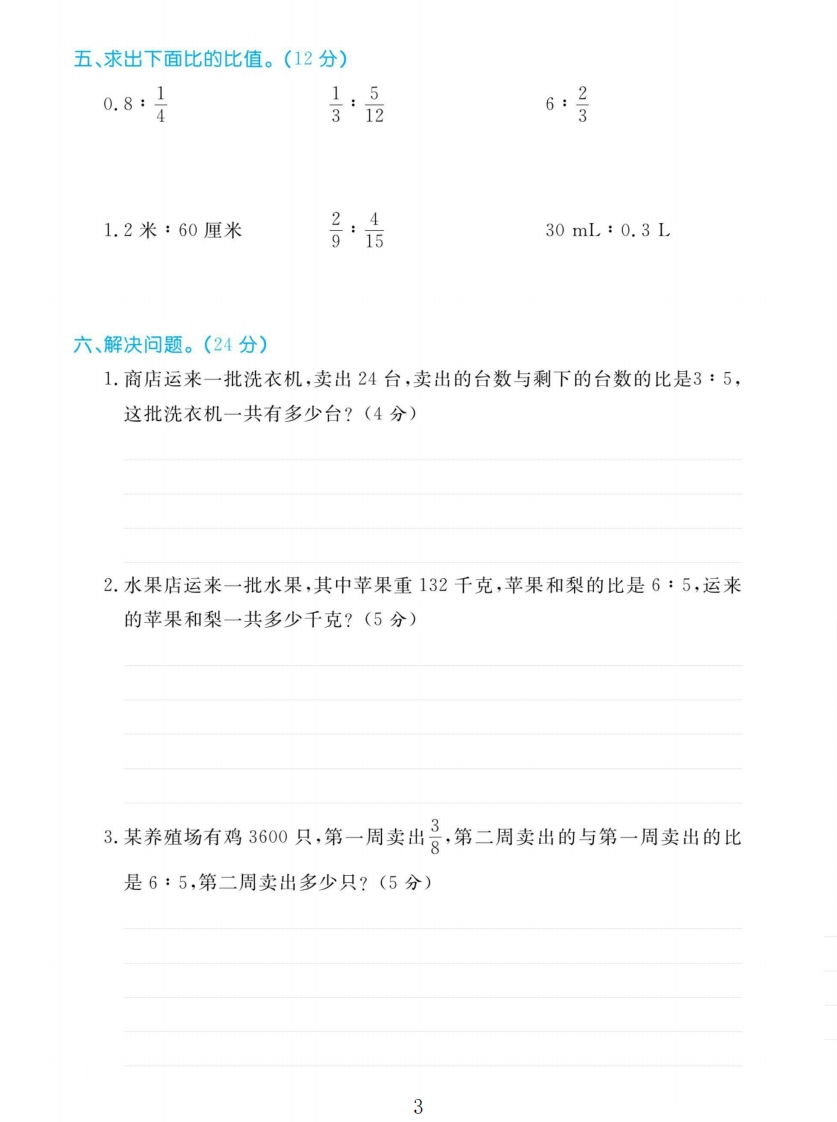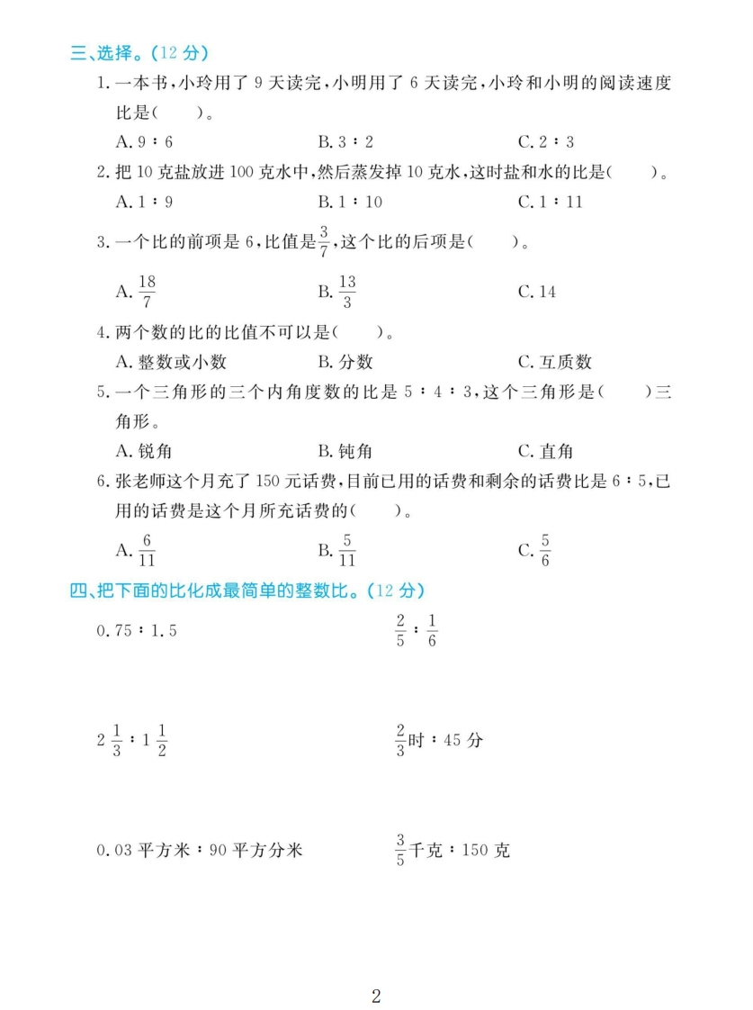 2025人教版六年级数学上册第四单元测试卷第四单元测试卷时间:90分钟满分:100分题号二三四五六附加题总分得分密一、填空。(28分)1.两个数相除又叫做这两个数的(封2.在a:b=c中,a是比的(),b是比的(),c是比的(毁3.六(2)班有男生20人,女生28人,男生人数与女生人数的比是(线女生人数与全班人数的比是()。4.如果3:7的前项增加12,要想比值不变,则后项应增加()。内5.单独行完同一段路,甲车用5小时,乙车用4小时。甲、乙两车的时间比是(),速度比是()。童不6.一批货物按2:3:4分配给甲、乙、丙三个队去运,甲队运这批货物的(号,丙队比乙队多运这批货物的—弓要7.正方体A和B的棱长比是2:3,A和B的表面积比是(),A和B的体积比是()。答8.右图中阴影部分的面积与长方形的面积的比是(二、判断。(12分)题1.鲁能泰山足球队以2:0战胜长春亚泰队,说明在特殊情况下,比的后项可以是0。)2.12:20=(12÷4):(20÷4)=(12×2):(20×2)()3.把20克糖放进180克水里,糖和糖水的比是1:9。()4.一项工程,甲单独做用10天,乙单独做用8天,甲、乙两人的工作效率比☒是5:4。)5.最简单的整数比,就是比的前项和后项都是质数的比。)侣6.4:3的后项加上6,要想比值不变,前项也要加上6。()1