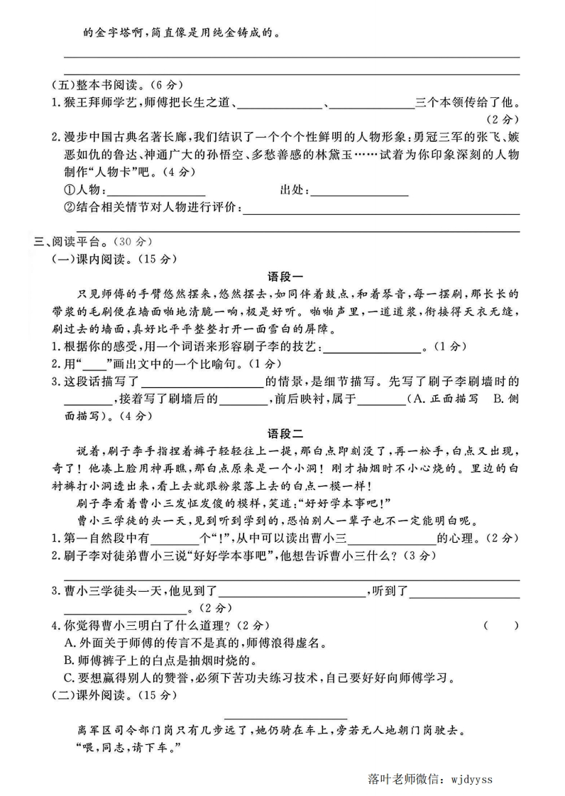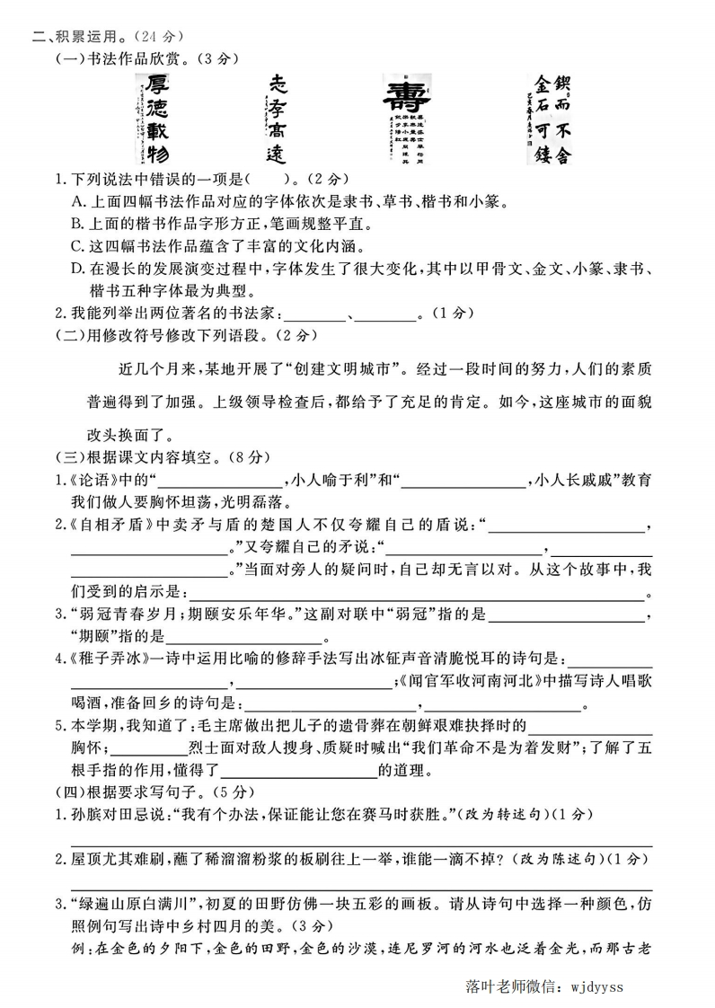 2024六年级上册语文开学摸底考试(五升六)测试时间:90分钟测试分值:100分题号二三四总分得分一、基础知识。(16分)1.联系语境,根据拼音填写相应的词语。(5分)揽星九天,探秘宇宙。2021年10月15日,翟志刚、王亚平、叶光富三名航天员带着光荣的使命登上了神舟十三号飞船。在此期间,习总书记多次通过视频通话,对三位航天员表示wiwèn(),关心他们的生活和工作。183天后,三位航天员平安抵京,人们手捧鲜花cùyδng()着航天英雄们,大家欢呼着、nàhǎn()着,欢迎英雄回家!这是一次teshū()的“太空出差”,将中国航天壮举载人史册,赢得了世界各国人民的高度zànǔ(2.下列加点字的读音全部正确的一项是()。(2分)A.倭瓜(w6)审视(shěn)遐想(xia)揿电铃(qin)B.绷带(bng)踌躇(chú)俘获(ǔ)水浆(jiang)C.霹雳(i)恐吓(he)黏液(nin)脚腕(wàn)D.幔子(man)澄澈(cheng)闲逛(guang)旖旎(y1)3.查字典填空。(3分)“挠”字的音序是,音节是,部首是“挠”字在字典里的解释有:①扰乱,使事情不能顺利进行;②弯曲;③搔,抓。“挠痒痒”中的“挠”字应取第种解释;“阻挠”中的“挠”字应取第种解释;“不屈不挠”中的“挠”字应取第种解释(填序号)。4.下列加点字的意思全部相同的一项是()。(2分)A.誉之曰称誉荣誉B.不可同时而立站立独立C.甚聪惠贤惠恩惠D.未闻孔雀是夫子家禽飞禽禽鸟5.下列加点词语使用不恰当的一项是()。(2分)A.上台演出之前要把服装道具准备好,免得到时候手忙脚乱的。B.她看见这惊险的一幕,吓得目瞪口呆,半天说不出话来。C.叔叔生得膘肥体壮,胳膊如檩腿如柱,走起路来踩得地板都吱吱响。D.即使这次考试失利,也不要垂头丧气,要振奋精神去迎接新的挑战。6.下列诗句所表达的情感与其他三项不同的一项是()。(2分)A.羌笛何须怨杨柳,春风不度玉门关。B.黄沙百战穿金甲,不破楼兰终不还。C.青山处处埋忠骨,何须马革裹尸还。D.遗民泪今胡尘里,南望王师又一年。落叶老师微信:wjdyyss