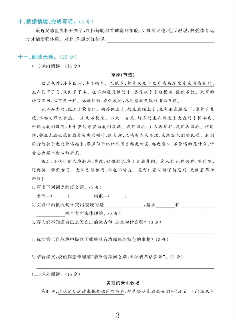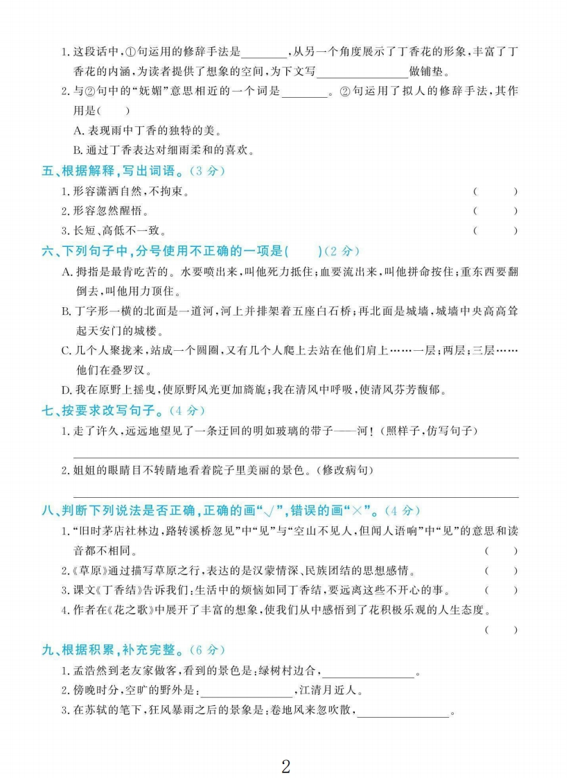 2025-2026学年六年级语文上册第一单元测试卷第一单元测试卷时间:90分钟满分:100分题号二三四五六七八九十十十二总分T得分拟风光秀丽的大自然,不仅能带给我们视觉上的享受,更能让我们的心灵得到洗涤。现在,就让我们一起背起行囊出发,去感受山川湖海的心跳吧。一、读拼音,根据语境写出词语。(8分)maotancaihongxique雨后有些凉爽,老人坐在上,望着天边的的youya紧叫声,更是平添了几分二、用“、/”给加点的字选择正确的读音。(3分)1.远处的湖泊(pōb6)里停泊(p6b6)着的那条小船上升起了炊烟2.一阵大风吹散(sǎnsàn)了鸟儿,只留下许多树叶散(sǎnsdn)落在地上。3.孩子用碗盛(sheng cheng)满水,慢慢浇着那株长得有些茂盛(sheng cheng)的野草。三、根据地名和人名的拼写规则完成联系。(3分)1.朱红艳在旅行的路上看到了这些路牌,知道了路牌中“佟麟阁”三个字的拼音分别是孙青岛路2.路牌“青岛路”下面的拼音应该是怎样的?写在图中的方框里。3.朱红艳自己的名字可以用拼音这样写:四、阅读句子,完成练习。(4分)①古人诗云:“芭蕉不展丁香结”“丁香空结雨中愁”。②在细雨迷蒙中,着了水滴的丁香格外妩媚。1