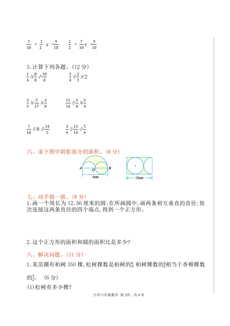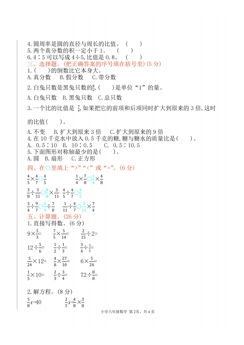 2022西师大版六年级上学期期中检测卷.··班级:姓名:满分:100分考试时间:90分钟.:第第二第三第四第五第六第七第八总题序题题题题题题题题分如得分:一、填空题。(10分)】1.):20=5÷()=():3530:2.圆的所有对称轴都相交于()这一点,圆的半径是直径的()。扇:形是由()和()围成的。3的倒数是),()的倒数是0.25,()和1互为倒数。4.20的是(),()的号是20。5.“白兔只数的相当于黑兔的只数”是把()的只数看作单位“1”,等量关系式是(:6.一个扇形的圆心角是60°,它的面积是所在圆面积的()。7.甲乙两数的比是2:5,则甲数是乙数的,乙数是甲乙两数和的一。8.在一个周长是17.6厘米的正方形内,画一个最大的圆,那么这个圆的半径是()厘米。9.工程队6天安装水管180米,安装的米数和天数的最简整数比是:二、判断题。(对的画“√”,错的画“××”)(6分)1.真分数的倒数大于1,假分数的倒数小于1。:2.一场足球比赛的比分是3:0,所以比的后项可以为0。3.男生人数的与女生人数的相等,男生比女生人数多。()小学六年级数学第1页,共4页