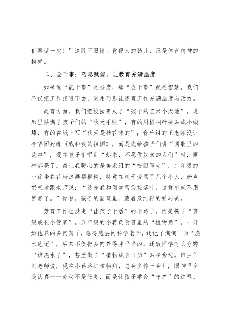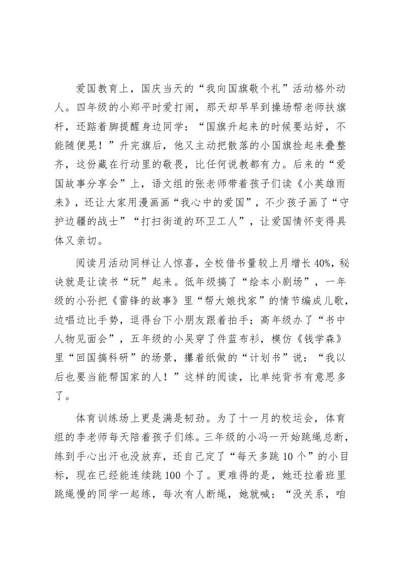 10月份德育工作总结会上,德育副校长讲话:守好育人主阵地,十月实干见真章以“能干事、会干事、干成事”推进德育工作各位老师、同事们:大家好!时间过得真快,金秋十月转眼就画上了句号。刚才路过校园,看到梧桐叶铺满小径,孩子们正蹲在地上捡树叶做书签一一这不正是“处处是课堂、时时在育人”的生动写照嘛!今天把大家召集过来,就是想一起复盘十月的德育工作,看看我们的付出有哪些收获,更要规划好接下来的前行方向。每次月底复盘,我心里都格外踏实,因为咱们这支团队,骨子里就刻着“能干事、会干事、干成事”的精气神!十月,我们紧扣“根植家国情怀,培育时代新人”的主题,把“五育并举”的理念揉进每一个活动、每一堂课、每一个细节里。教育从不是空洞的口号,而是让孩子们在可感可知的体验中长本领、明事理。这一个月,我们用行动交出了一份扎实的答卷。一、能干事:五育并举,把责任扛在肩上要说“能干事”,咱们团队绝对名副其实!十月的德育工作,每一项都落地有声,五育并举的蓝图被我们一笔一划地绘了出来。