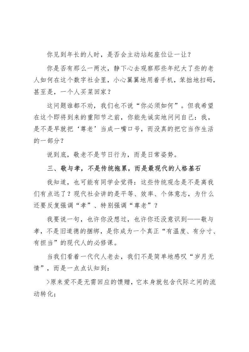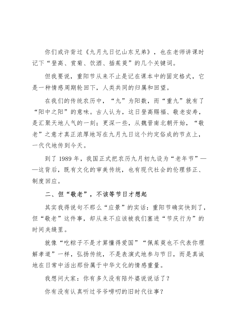 2025重阳节,校长在国旗下讲话:敬老传孝道,重阳寄深情尊敬的各位老师,亲爱的同学们:大家上午好!今天的清晨依旧带着些许凉意,可我相信,站在国旗下的我们,每个人的心,是暖的。这份温暖,一半来自阳光,一半,也来自心头即将抵达的那个特别节日。10月29日,也就是后天,我们将迎来中国传统的重阳节一一农历九月初九。这不只是一个日子,而是一段我们民族记忆深处留下的仪式感,是中华文化千百年来反复叮咛我们去珍视的一件事一敬老、孝亲、传承与感恩。今天,我就想借这个契机,和大家聊一聊:为什么即将到来的这个节日,在我们这样一群青春年少、刚刚奔跑在起点的年轻人身上,依然值得认真地、郑重地被标注与铭记。一、关于“重阳”这两个字,不只是插茱萸与登高远望我知道,对于很多同学来说,“重阳节”更多是出现在语文课本,或者古诗背诵的训练册里:你们一定读过王维的那句一一“遥知兄弟登高处,遍插茱萸少一人”;