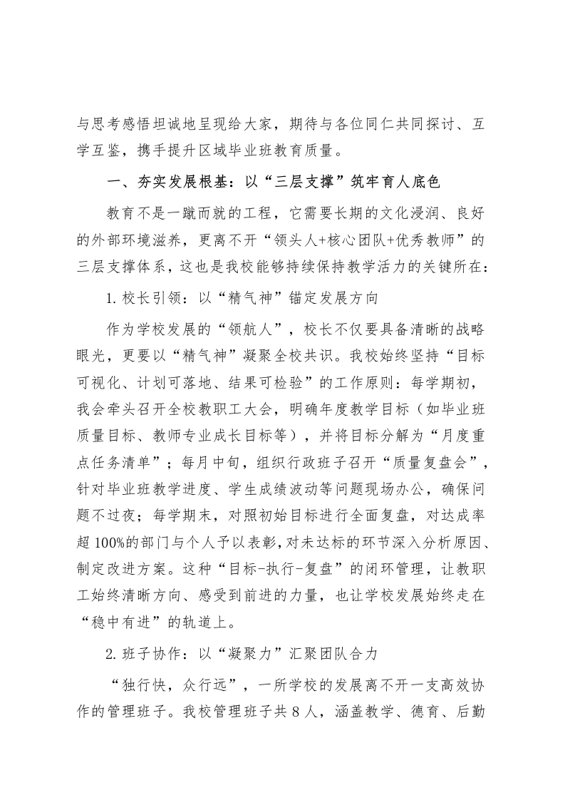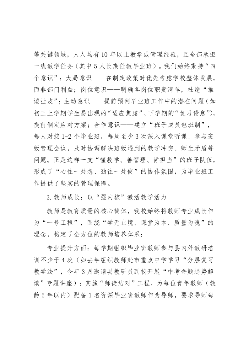 初中校长汇报发言:筑牢三层支撑、深耕四位一体一初三毕业班工作汇报(兄弟学校交流会)尊敬的各位领导、各位同仁:大家好!多年来,我们学校始终以“提质创优”为核心目标,深耕教育教学领域,教学质量实现稳步攀升一一近五年中考,我校毕业生升学率连续保持在98%以上,省示范性中学录取人数年均增长12%,多次获评“县级教学质量先进单位”。这份成绩的背后,离不开各级领导的悉心指导与政策支持,更凝聚着全校教职工日复一日的坚守、汗水与智慧。在此,我谨代表Xx学校全体教职工,向长期关心支持我校发展的各位领导致以最诚挚的感谢,也向为本次交流搭建宝贵平台的兄弟学校、以及不远千里前来分享经验的老师们,表达最衷心的谢意!面对领导的殷切期望、家长对优质教育的迫切需求,以及我校过往中考积累的优异口碑,我们既倍感荣光,也深知肩上的责任之重一一前任九年级教师创下的“连续三年县中考前十”佳绩是标杆,他们“5+2”“白+黑”的拼搏精神更是我们必须传承的宝贵财富。今天,我不愿以“汇报者”自居,更希望以“分享者”的身份,将我校毕业班工作的实践路径、管理细节