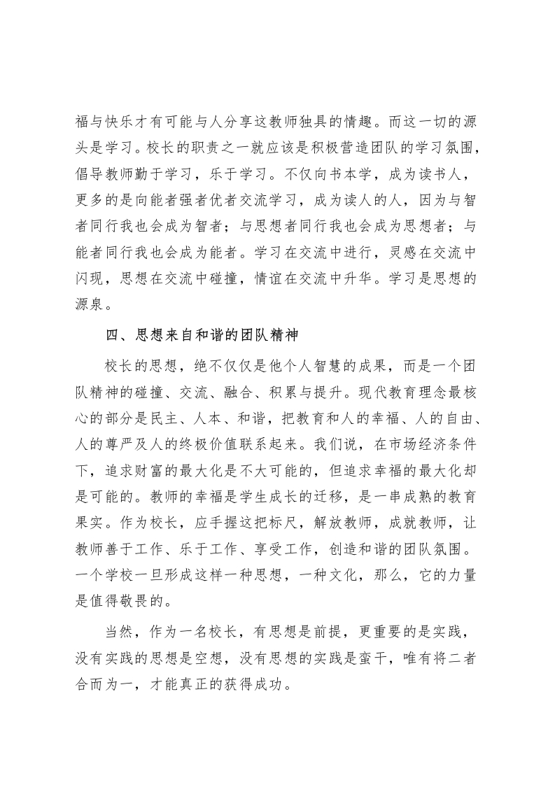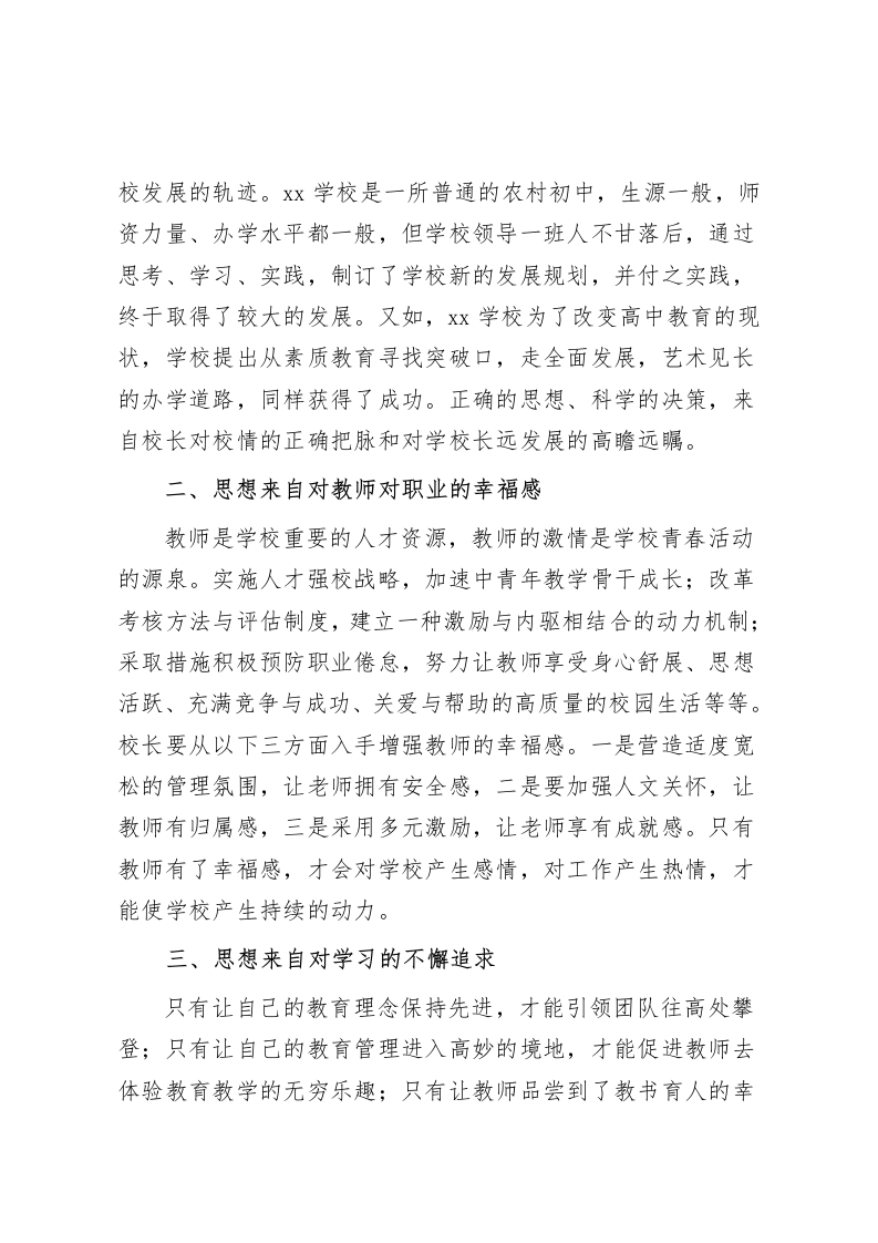 读书分享会上,校长谈体会《成为一名有思想的校长》读书心得各位领导、老师们:这个暑假,我认真阅读了《成为有思想的校长》这本书,感受颇深,获益匪浅。该书以经典的案例来阐述作为一名校长应从对学校的发展、对学生的成长及对教师的成长都必须进行思考,从而成为一名有思想的校长。我发现,从这些校长的案例中可以看到,他们的魅力源自于他们的思想,他们的成功同样源自于他们的思想。思想决定态度。一所学校可以没有高楼大厦,可以没有先进的设备设施,甚至一流的生源,但是却不可以没有学校所独有的思想,即个性鲜明的办学理念,顺应时代要求社会发展的人才培养目标,和谐健康的校园精神文化生活。因为,惟有科学的个性化的思想才能支撑起一所学校真正意义上的高楼大厦。前苏联的苏霍姆林思基还有国内的名校,校长们之所以在平凡的教育园地里做出不平凡的业绩,就是因为他们超越了一般功利的境界而率先占领了思想的高地。一、思想来自对学校发展的高瞻远瞩校长肩负着对一所学校的科学决策、高效运作的职责,决策与措施是否科学,管理运作是否高效,将直接影响到一所学