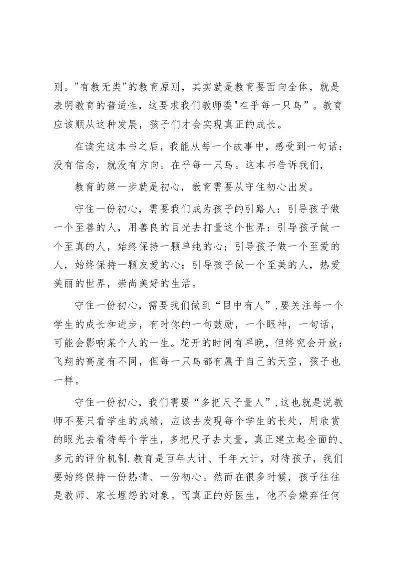 副校长读书分享会《在乎每一只鸟》读后感守护教育初心,静待雏鸟展翅一一《在乎每一只鸟》读后感尊敬的各位领导,各位同事:大家好!很高兴有机会与大家一起分享读书的收获与乐趣。莎士比亚说过:"生活里没有书籍,就好像没有阳光:智慧里没有书籍,就好像鸟儿没有翅膀。"今天我为大家推荐一部我很喜欢的书籍《在乎每一只鸟》,这是一位教育者的独白。刚拿到这本书时,看到封面,我就特别想听听这位教育者的独白究竟是怎样的。就这样开始了我的读书之旅。作为一名二十余年来辛勤耕耘在中学教育田园里的教育工作者,本书作者通过对自身在教学实践与生活中所读、所见的不断反思,记录自己对育人这件事的所思所想。无论是教师、教育管理者还是家长,都能够从本书中获得关于如何优化教育实践的一些感悟。整本书分为六个板块,分别是在乎每一只鸟、顺性而育、莫错过了“芳华”、教育即心育、孩子,你是我的脸、谨防家庭教育的"无证驾驶”。六个板块里面又讲述着不同的内容,内容十分丰富。